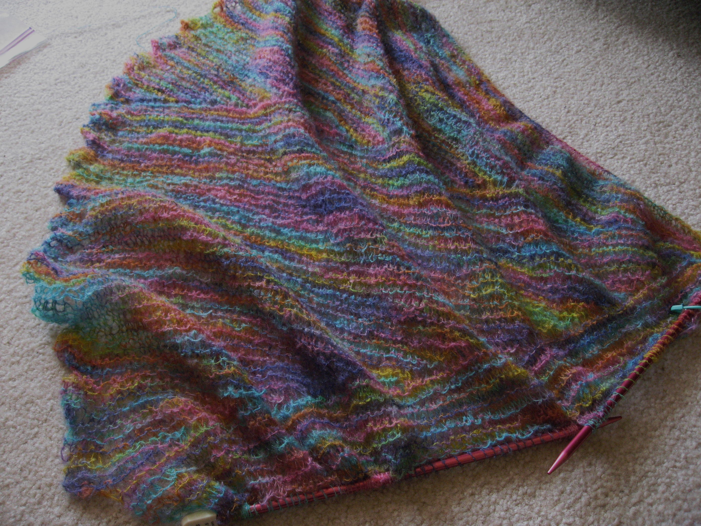 Loving this pattern. Although it's garter stitch and very simple (you can do it, Jane, not the Quiddity one, but my sister, Jane), it goes really quickly and the colour changes of hand painted or variegated yarn keep it interesting.