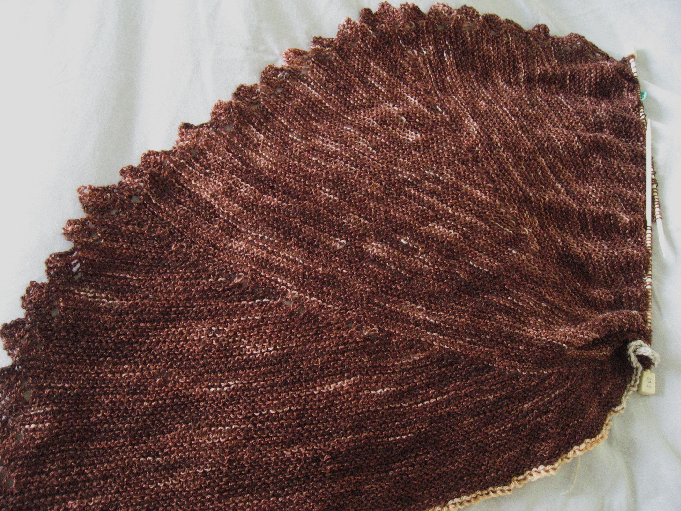 Kids grown up, work devolved from hair raising direct service to the role of full time in-office professional money begger, the dental visit doesn't have the pull for me that it used to. Now, while lying back in the chair, between a mouthful of conflicting tickle and prick sensations, my eyes are closed and I'm thinking of knitting. It's the project above, another Free and Easy Pie Wedge Shawl. In laceweight, they can be scrunched into lightweight scarves. This one is made of hand painted semi solid Zephyr. It's difficult to find hand painted semi solid laceweights, especially in tones of brown, so if you're interested, check out Beyond Basic Knits.