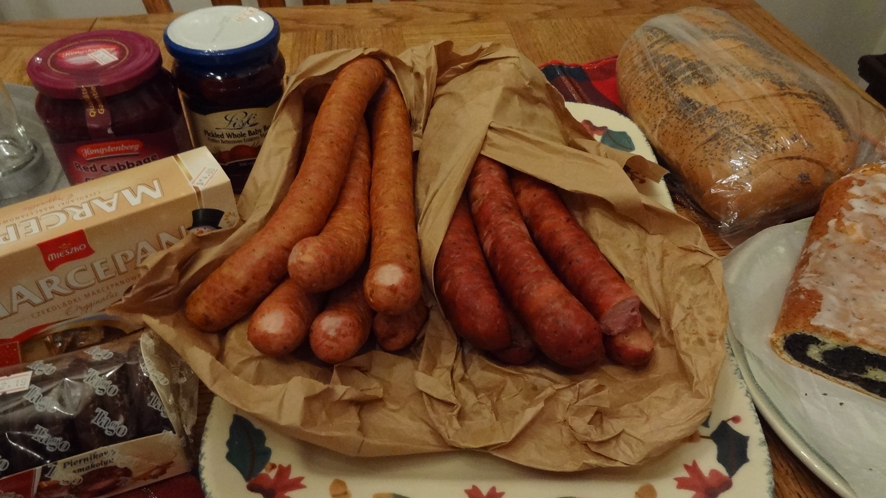 Two kinds of sausage - double and triple smoked, rye bread, pickled beets, red cabbage, ginger bread cookies, marzipan and poppy seed cake. All that's left are the fish, cheese and the akvavit. Skoal!