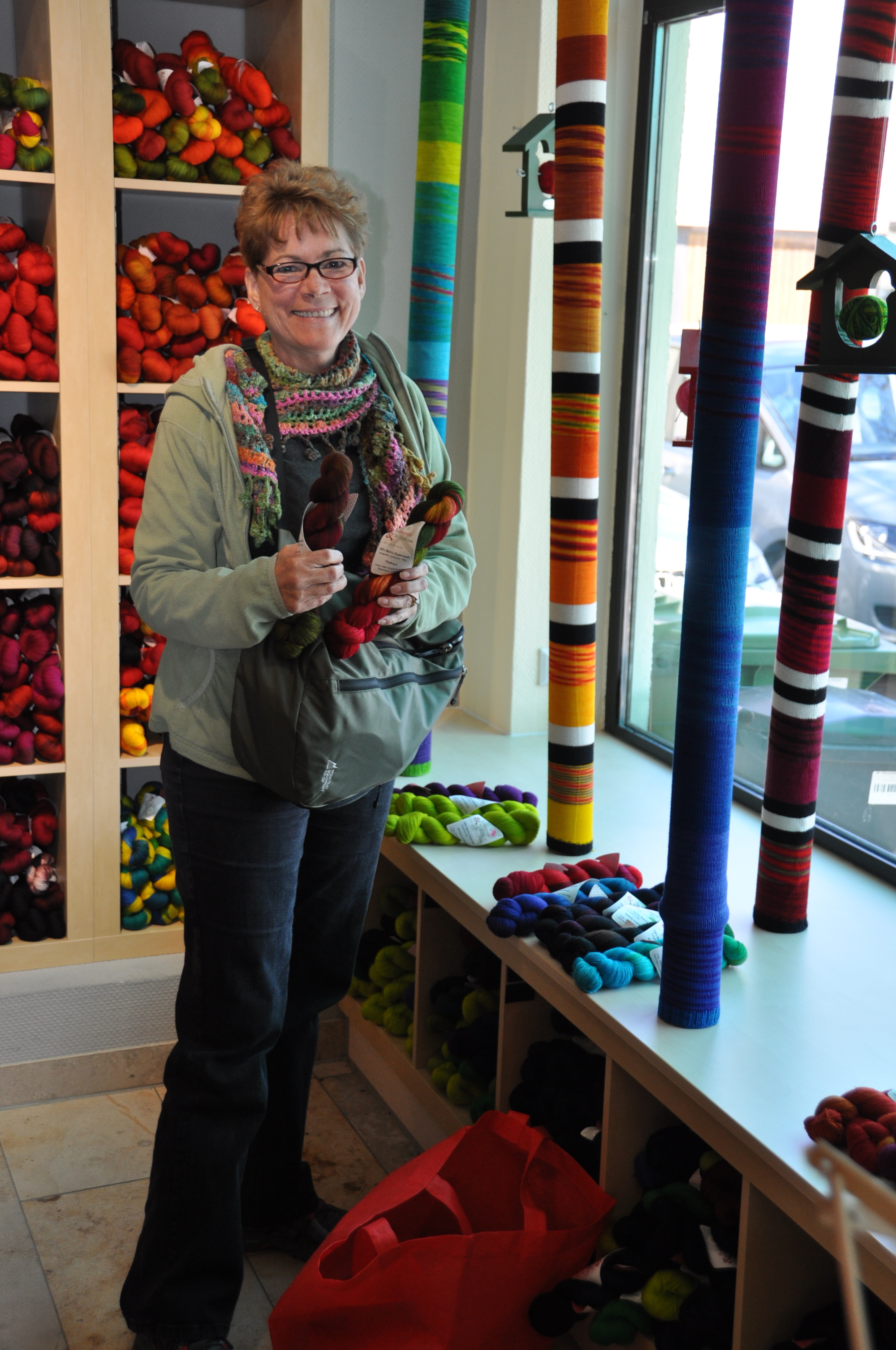 The store is small, three walls and the front lined with windows with a shelf below. Enter the door. The wall to the left is for yarn called "We are not perfect," seconds with slight flaws, each explained on the label. The wall to the right holds current perfect sockweight stock. The middle of the shop has couches surrounded by baskets of laceweight yarn, all seconds. Under the windowed wall are the clearance skeins.