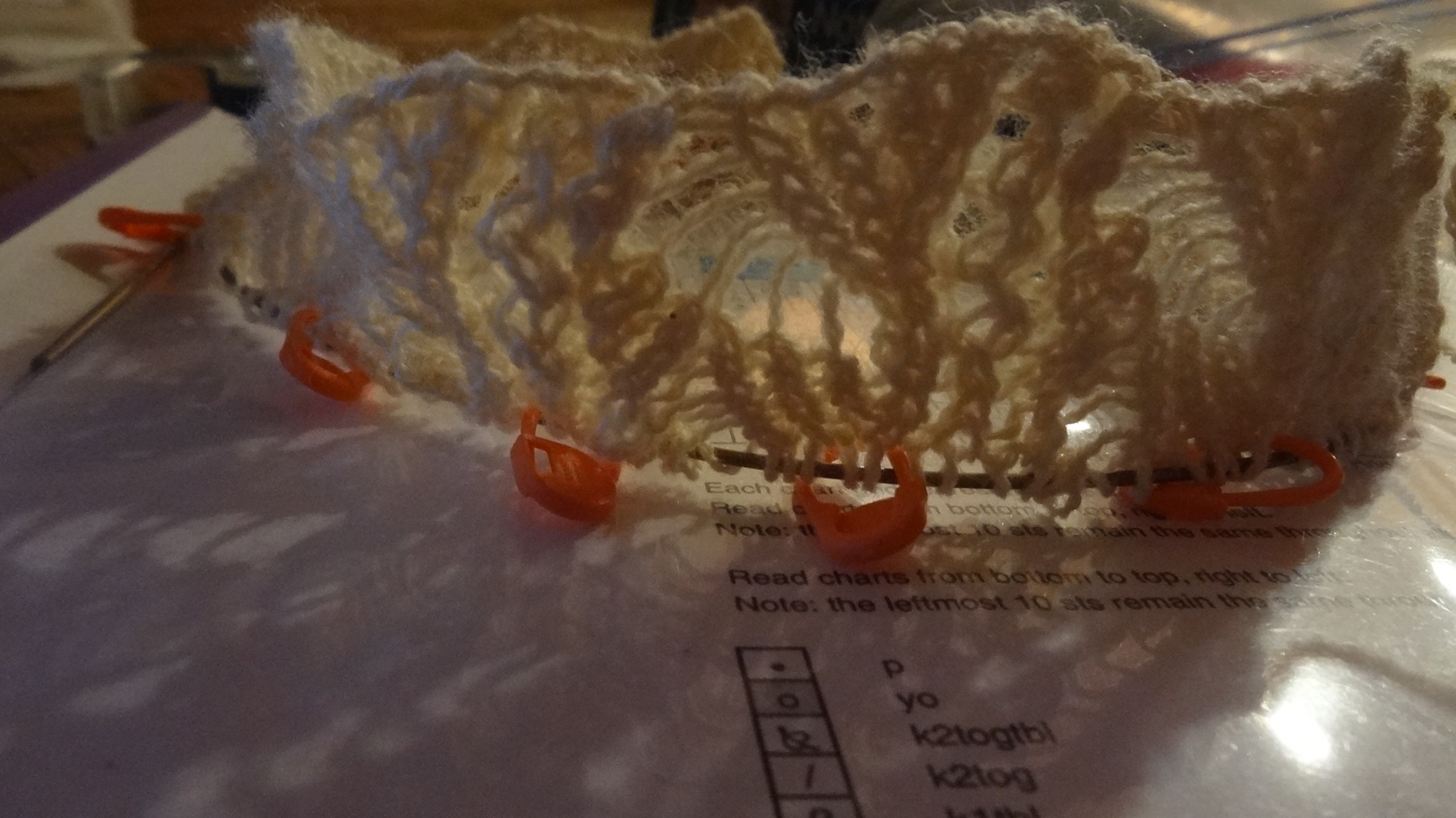 Happily knitting, this yarn is like a laceweight version of Silky Wool. Working on Chart B of the Flared Lace Smoke Ring: