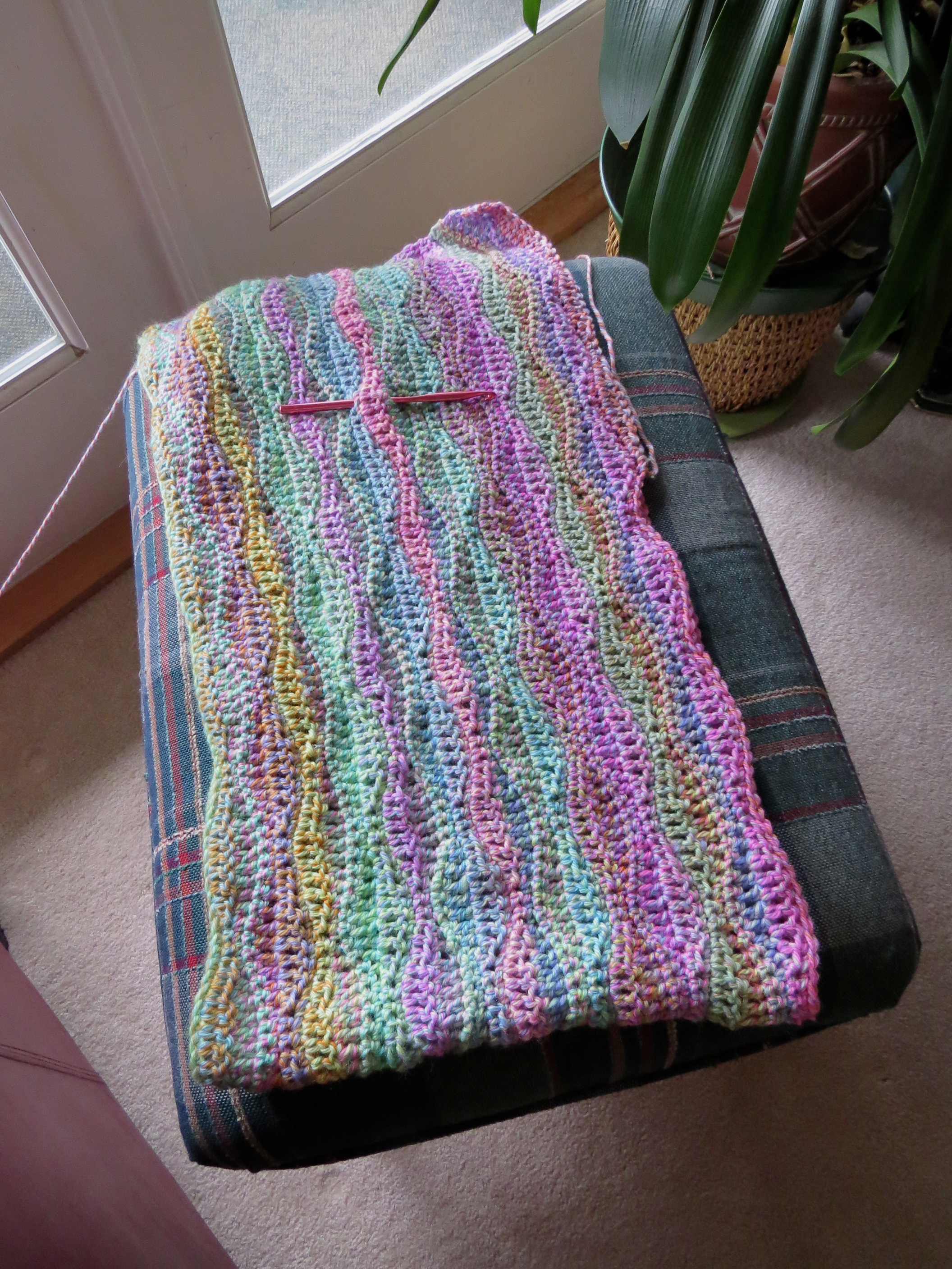 The fang marked and bruised leg have me laying low, but the finger has healed enough to wield a hook of the crocheting kind, and I've put that Jojoland Rhythm to good use for a New Wave Throw: