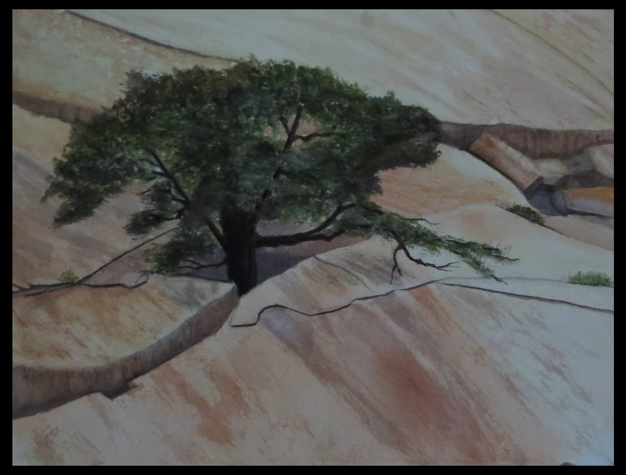 It's the last for now, I promise. Last week's watercolour class was a scene I wouldn't have believed if I hadn't seen the picture with my own two eyes. It's a tree growing out of a crevasse in Enchanted Rock State Natural Area in Texas: