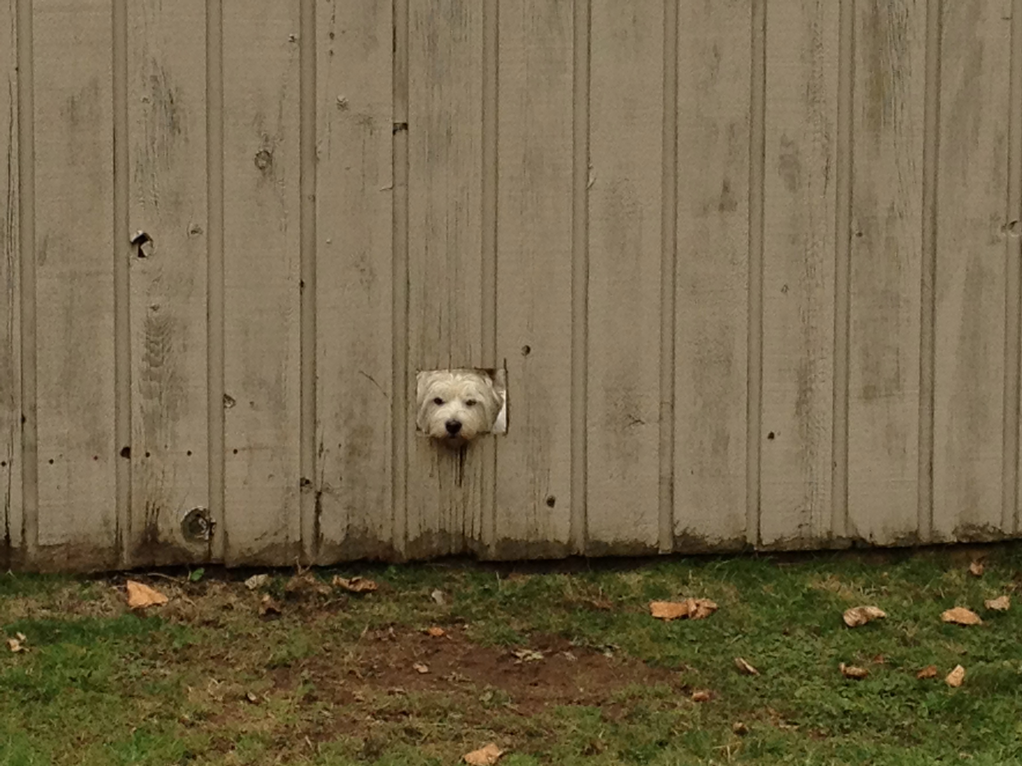Zooming in, I discovered this adorable Westie face peering through his custom window: