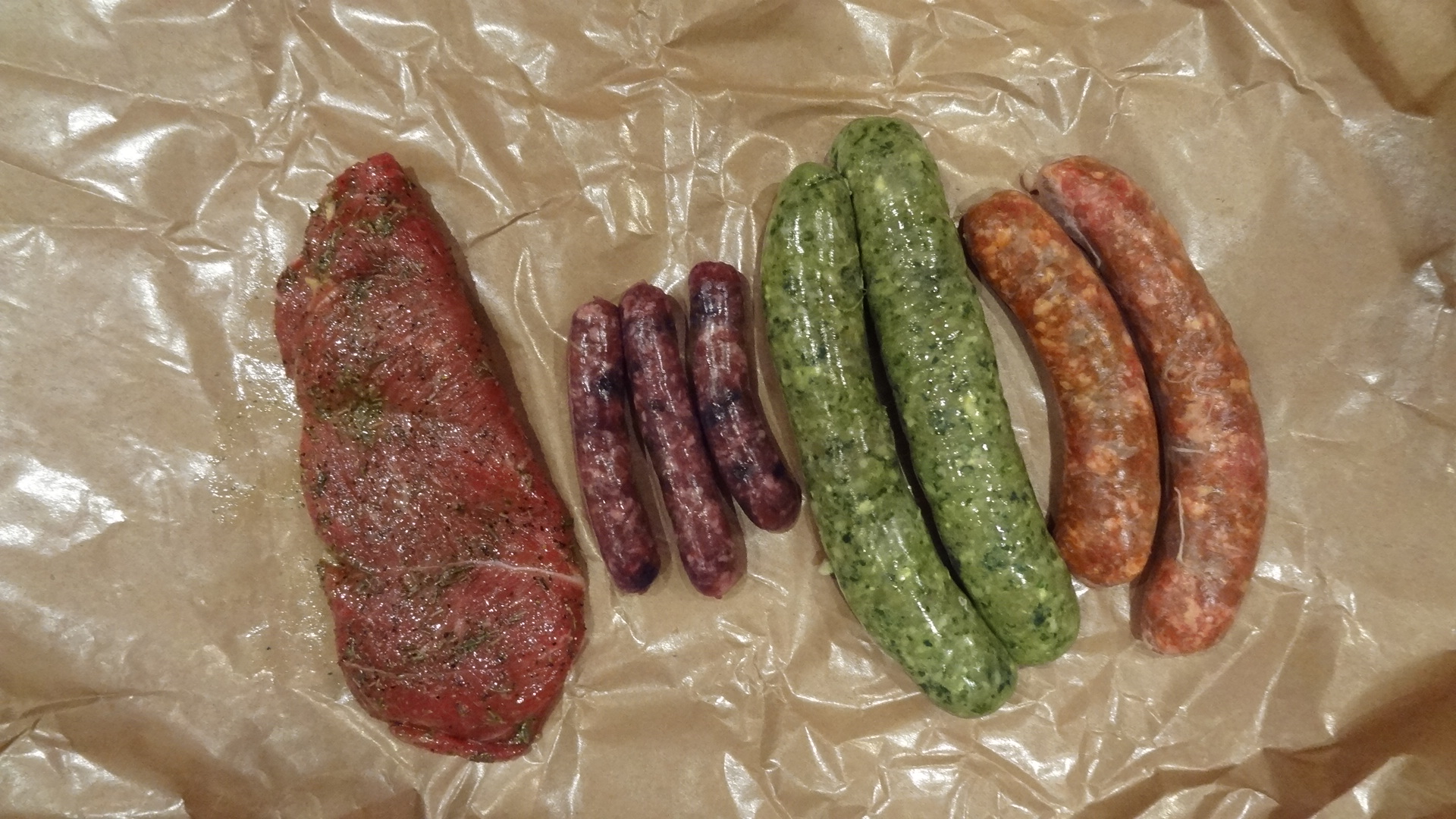 Too fried from meeting deadlines to face going out to dinner on a wet and dreary Pacific Northwest night, I stopped in at the grocery store to find NO turkey legs. The butcher offered me two choices: come back tomorrow or buy sausages on special. My decision, after whining "But Thanksgiving is todaaaaay," included a lamb steak, and three varieties of sausages: blueberry and maple (looking somewhat coagulated), kelly green chicken kale and feta, and red hot chorizo.