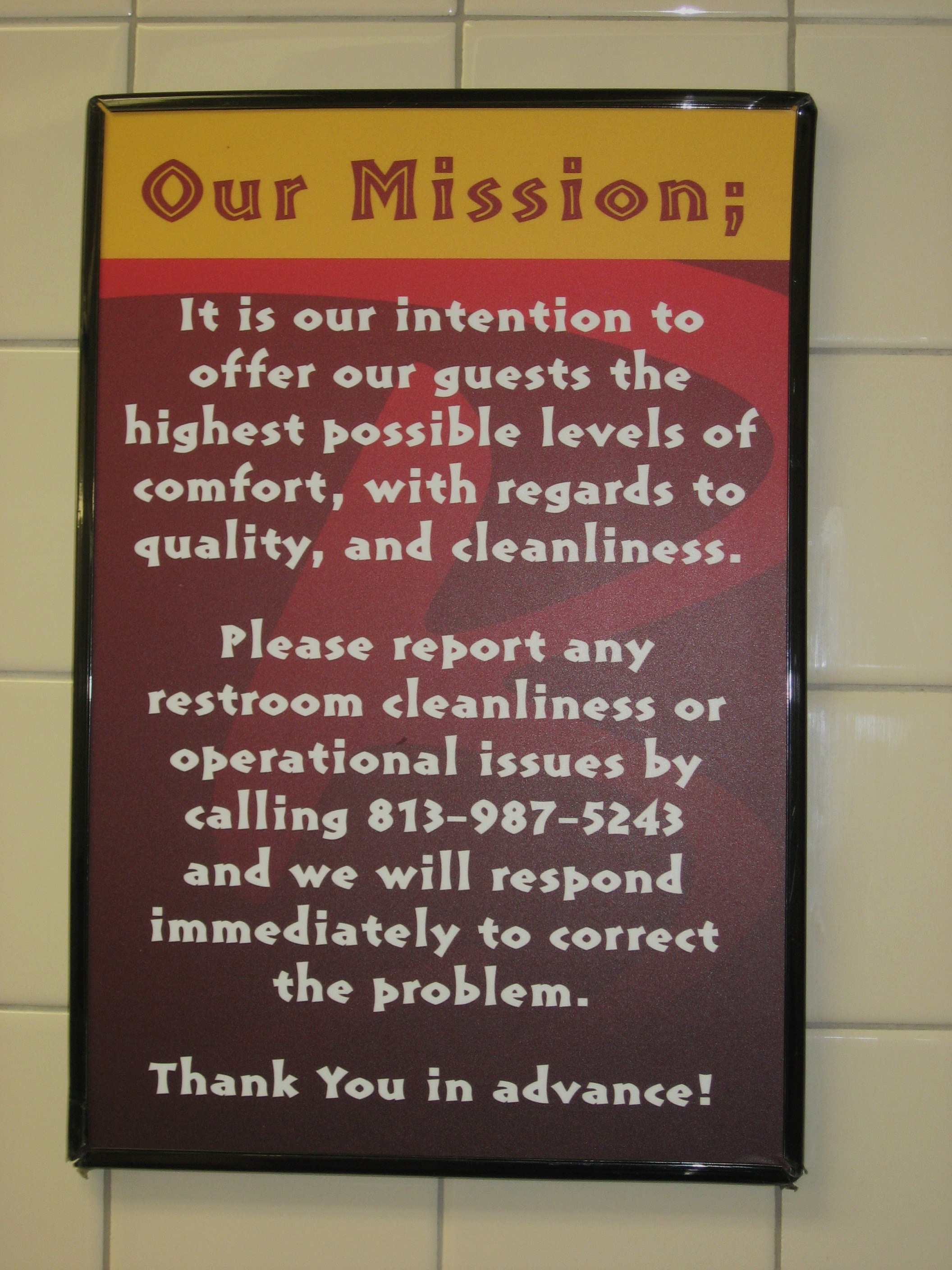 The first one was a ladies' room mission statement taken at Busch Gardens in Florida: