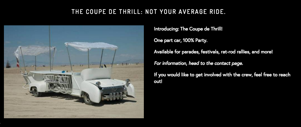 Now why might he need a portable garage, you ask, when he doesn't currently have a valid driver's license? To house his art car, of course, in preparation for Burning Man 2016. Introducing, The Coupe de Thrill: