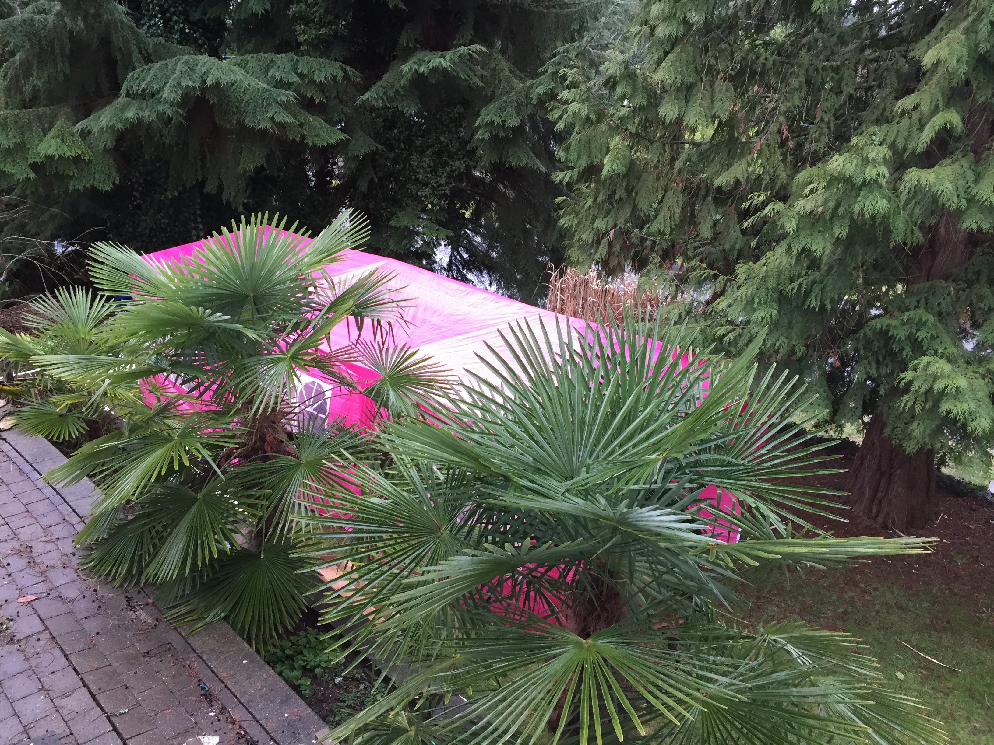 Not in this house, especially one filled with creative types. And B's creativity levels far exceed one person's worth. Look closely, what's hiding in my yard? No, not another school bus, but a portable garage. In hot pink. He couldn't get the white, grey or cool camo variety, it's shocking pink.