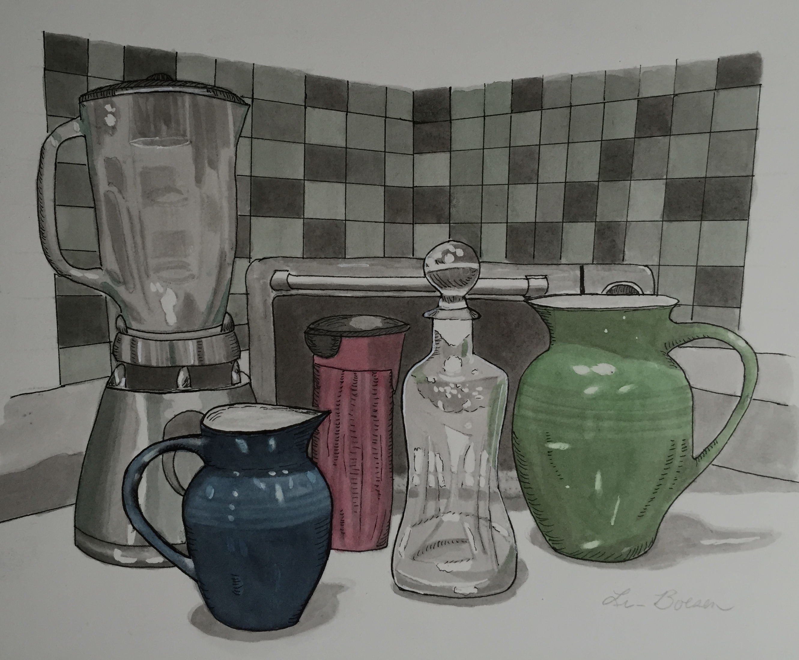 Love your kitchen sketch. The pitchers, blender, Is that a radio I see in the background? Only one curse word with that pattern in the background? Pretty good.