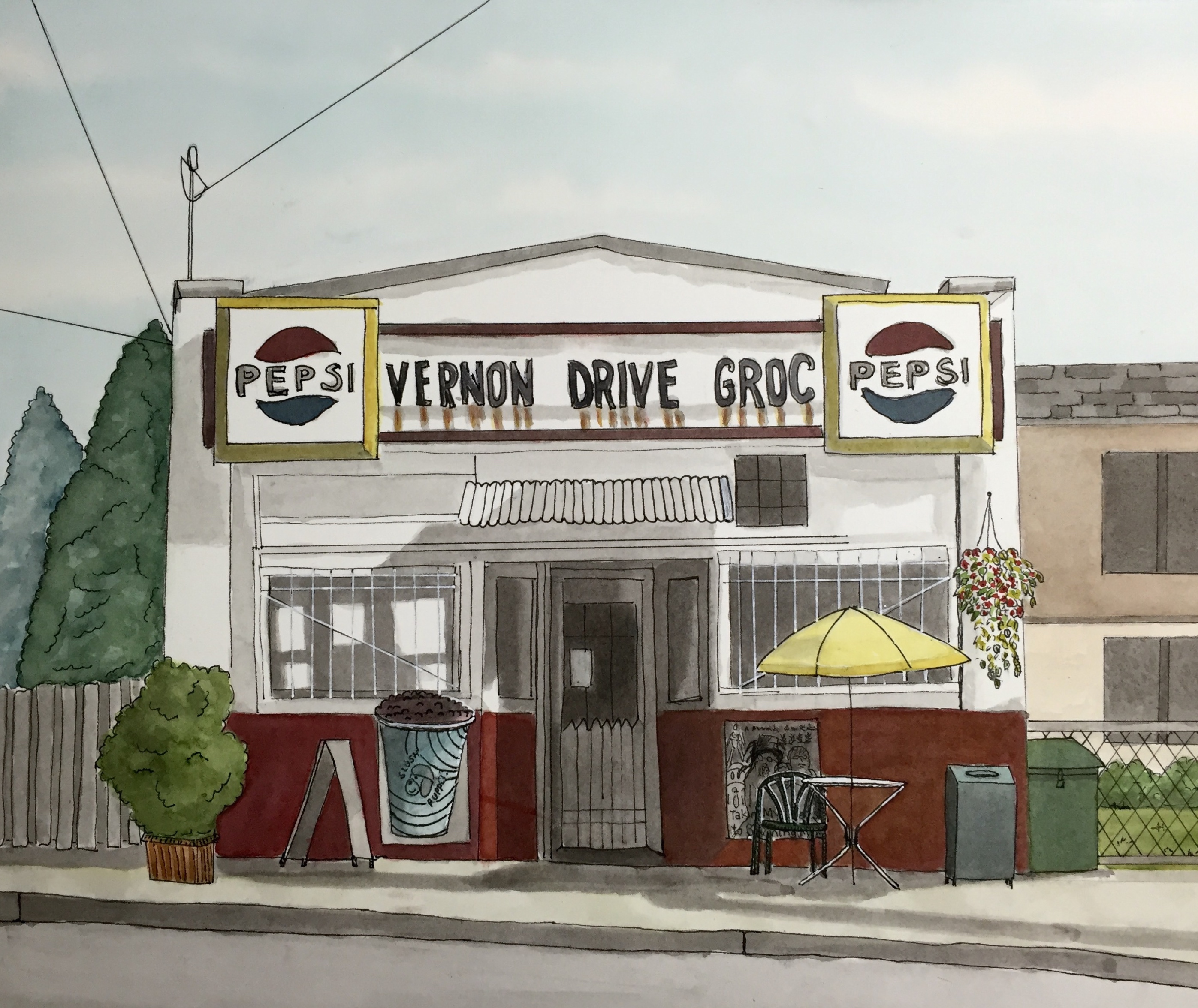 I submitted another assignment to the ink and watercolour illustration course I'm taking online (I LOVE retirement). It's of a Vancouver anomaly, the Vernon Drive Grocery store, which has had an extraordinarily long lifetime. It has existed as a convenience store for over 100 years. It's a different style than the painting in my last post, but I'm really enjoying the change and look forward to trying some of my house portraits using this method (this is the post with the first assignment I submitted for the course).