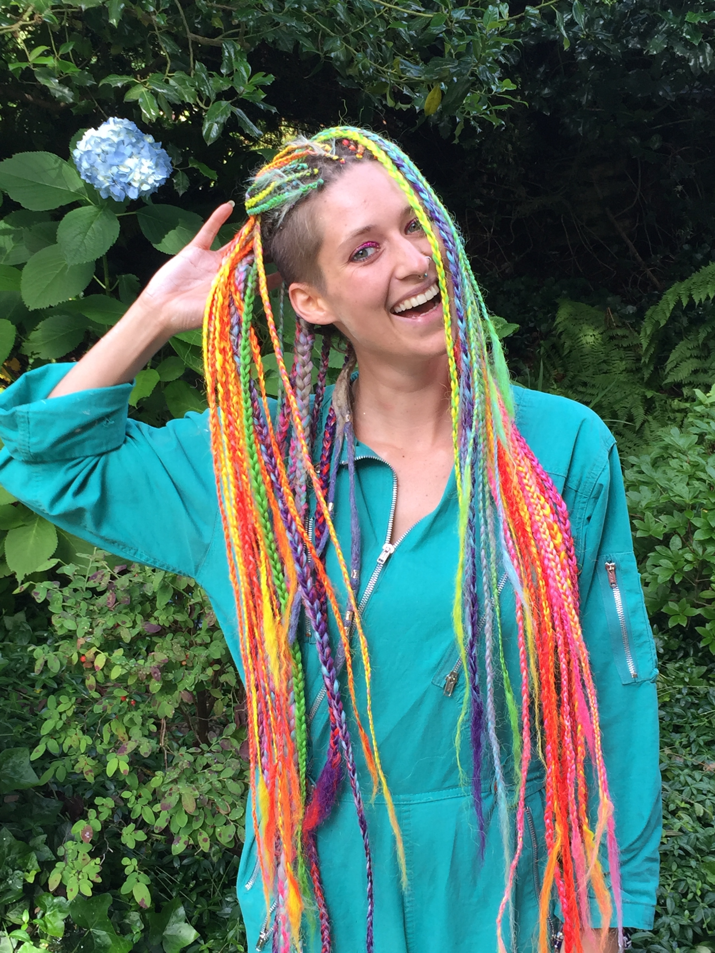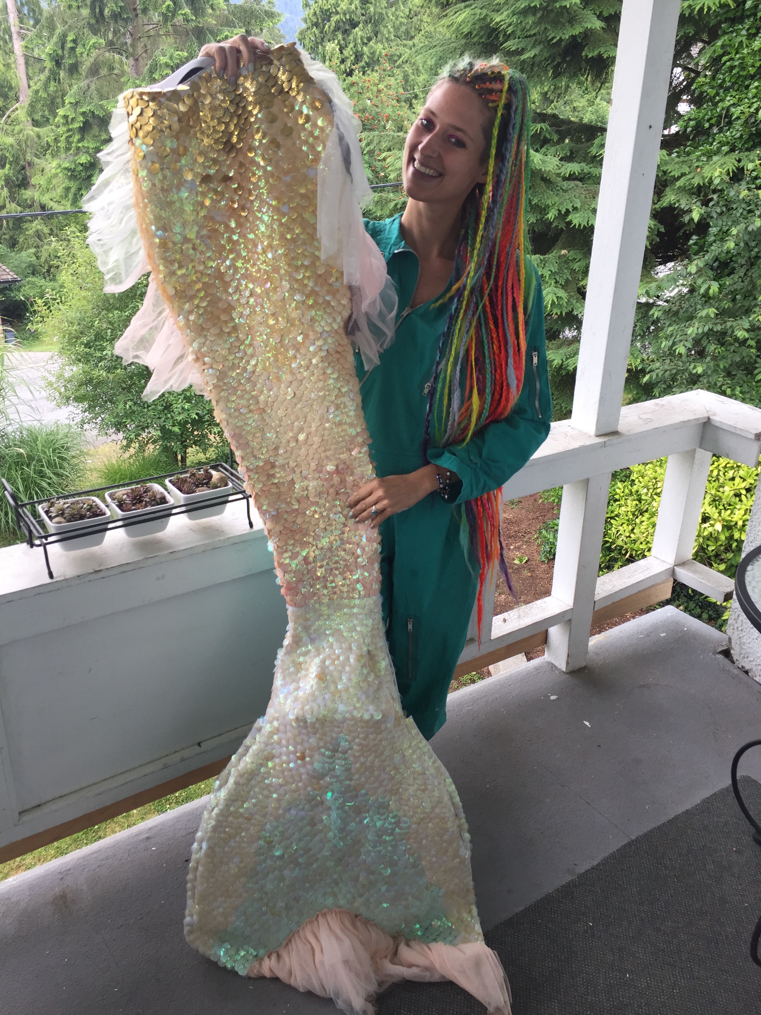She was given a difficult time at security upon departing from her first stop in Canada, with multiple scans of her hair and a thorough going over under each braid with explosives detection wipes. She's a creative one, this child, a costume designer and mermaid model by profession. Here's her tail, hiding her socks, striped of course.