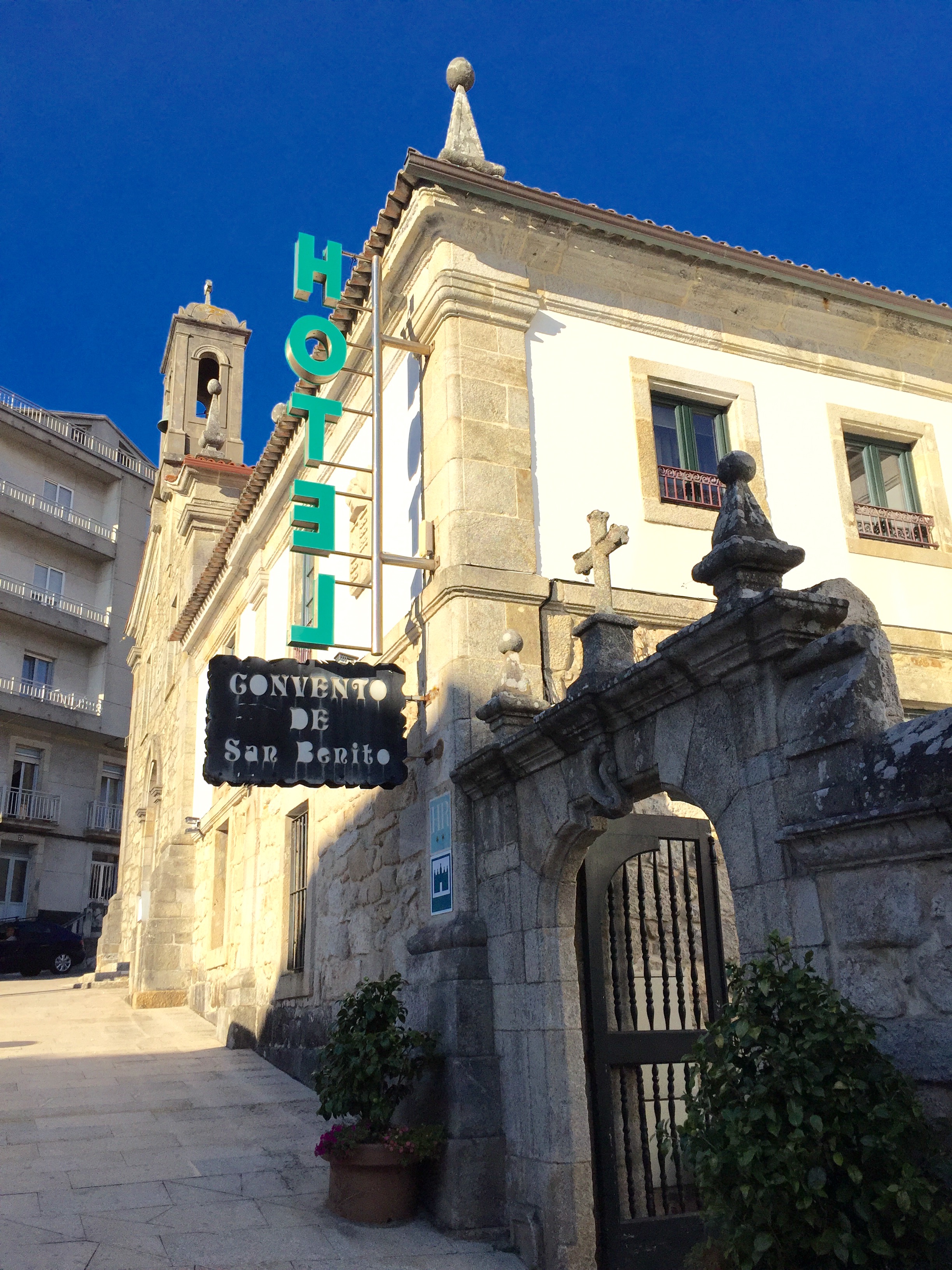 We're staying at a beautifully renovated 17th century convent. The nuns lived here until 1984. In 1991 it was bought and renovated by an art collector/investor.  One room has a collection of 14th century china and from the 16th century, ceramic tiles with the Camino scallop shell.