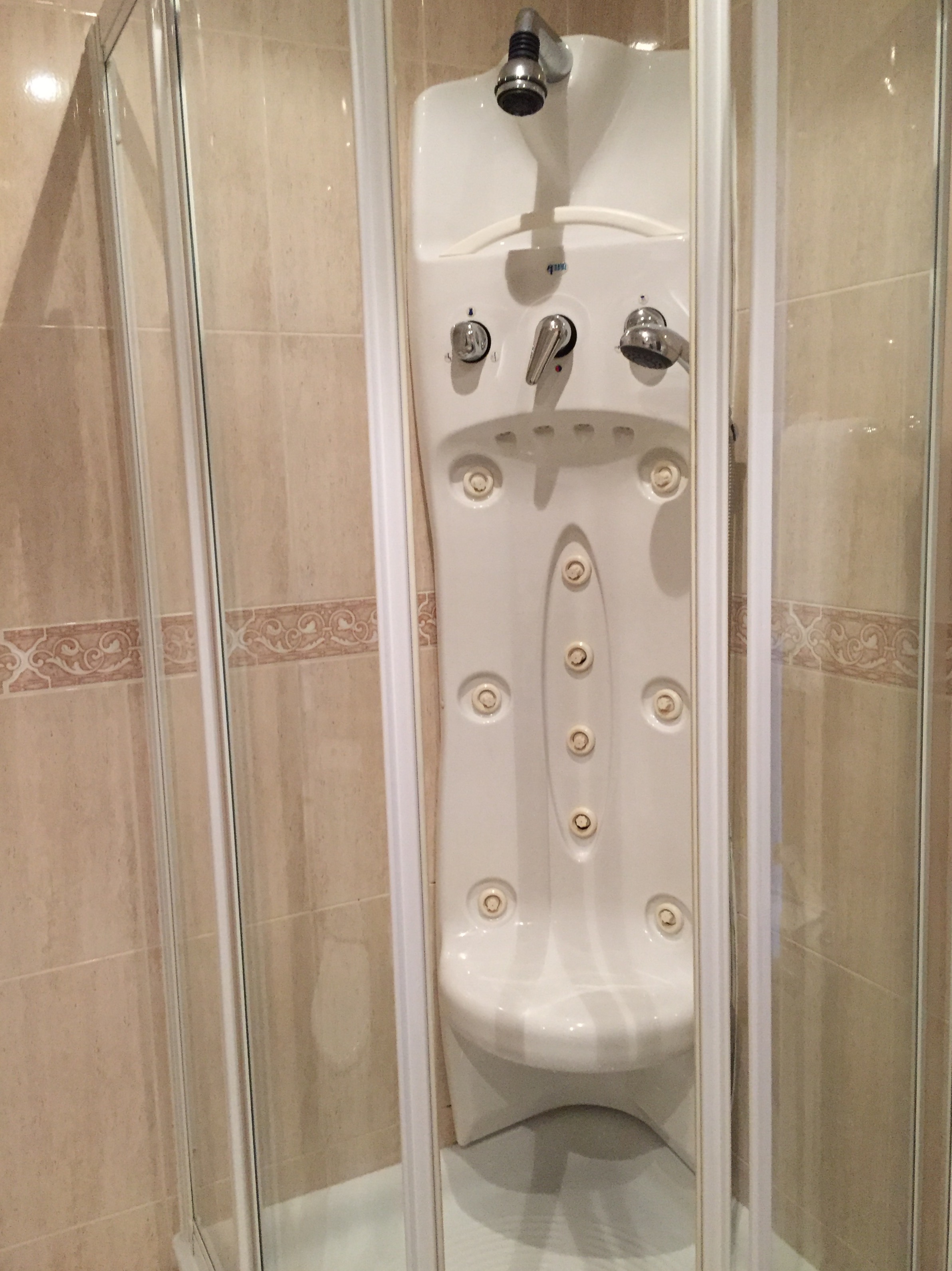 The system of Paradors are super luxurious hotels, built by the Spanish government, starting at 150e nightly. I think I wrote about them last year. Located in historical buildings, some have iffy pasts. I believe the one in Leon served as a place of torture during the Spanish civil war. I supposed many buildings of historic significance come with a past. Given the euro to Cdn exchange rate, I'll pass on the ironed monogrammed sheets and towels when my worn hotel room has a shower like this: