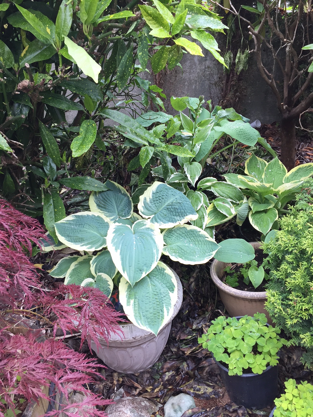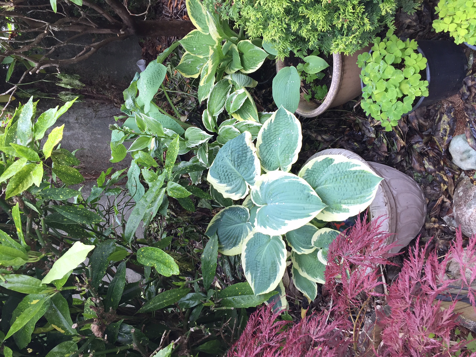"My hostas." Some from our previous house, making them thirty years old when I met their acquaintance. Who knows how old they really were? How many houses they had seen?