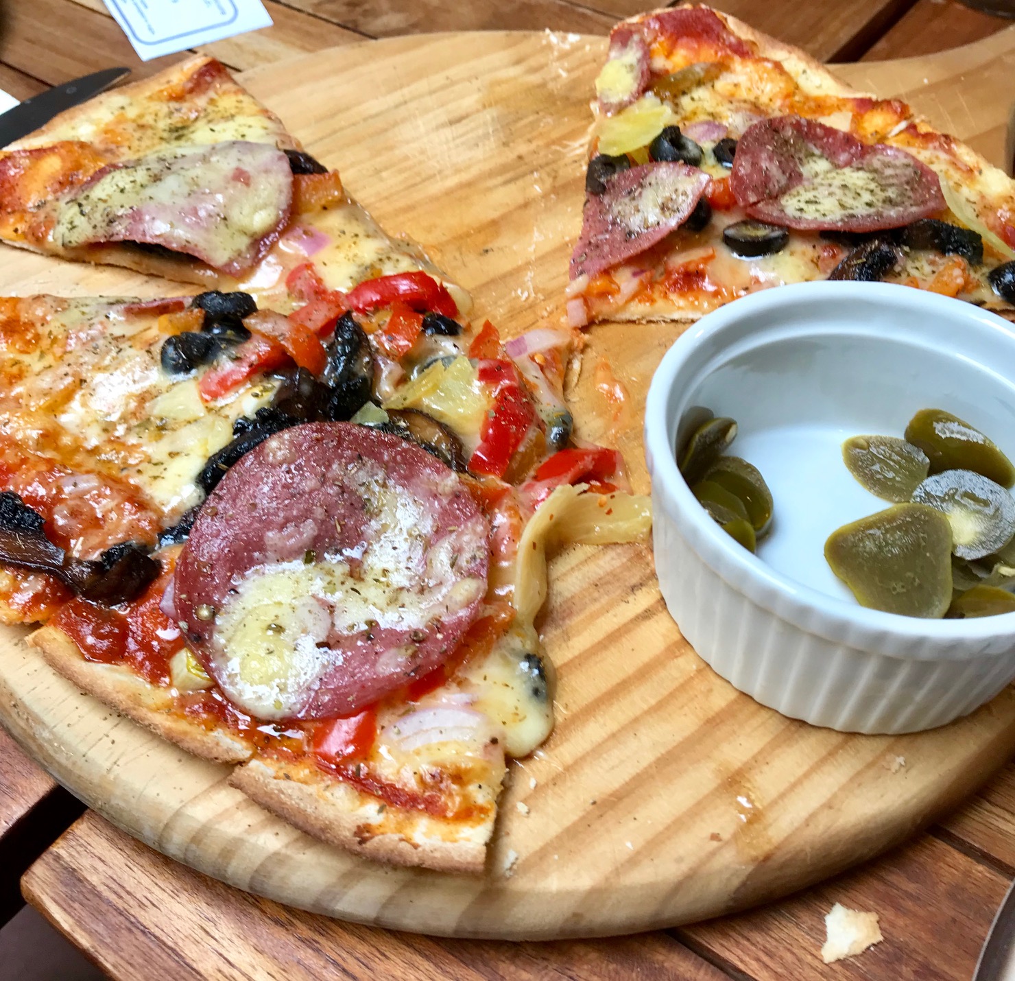 We eventually donned our rain gear and hit the dockside bar for lunch: a Punga Bay Special Pizza: venison salami, red peppers, mushrooms and shaved Parmesan. Ok, a step up from an OSM bar.