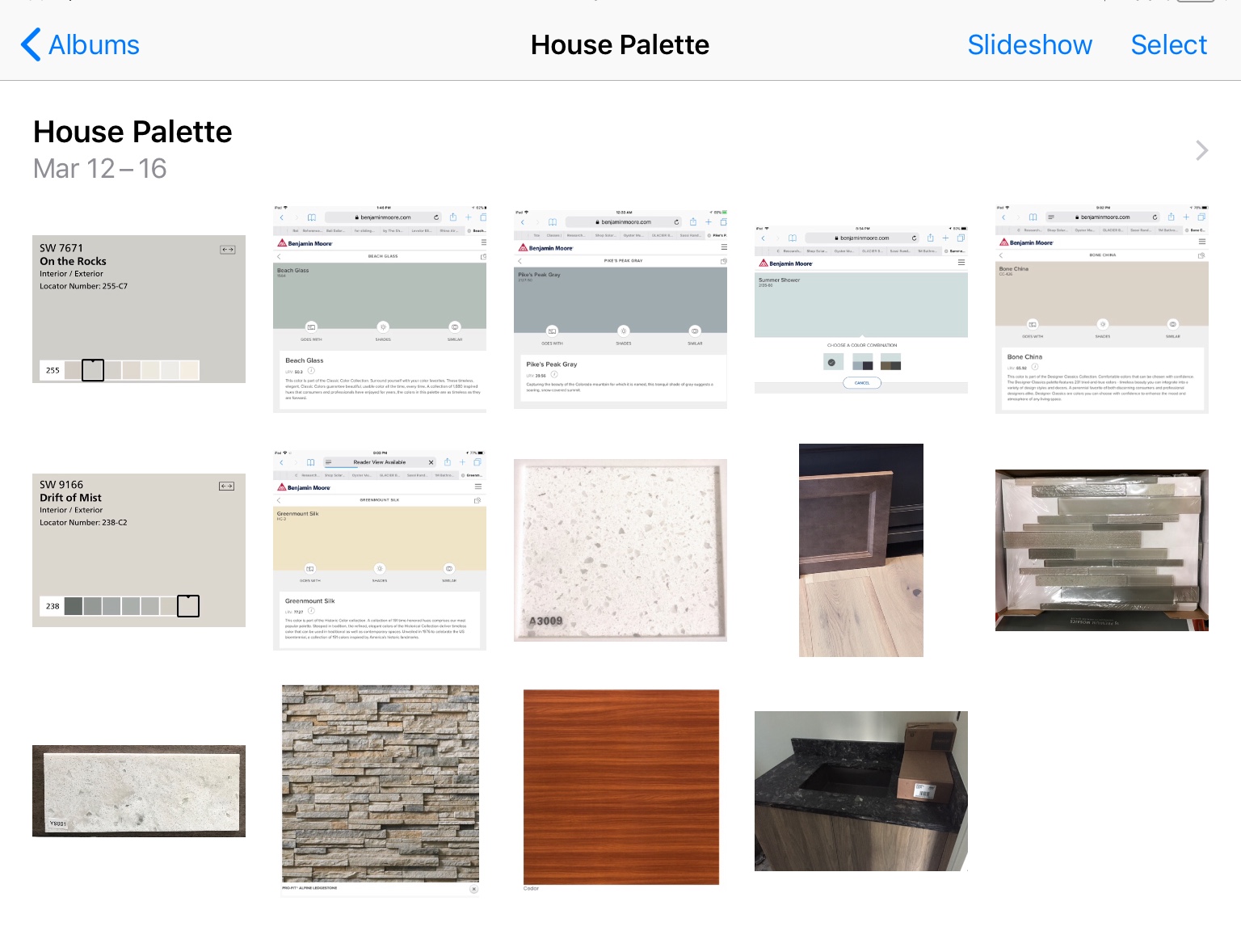 Here is is, the official interior colour palette, minus a couple of vanities and the bathroom ceramic tiles.