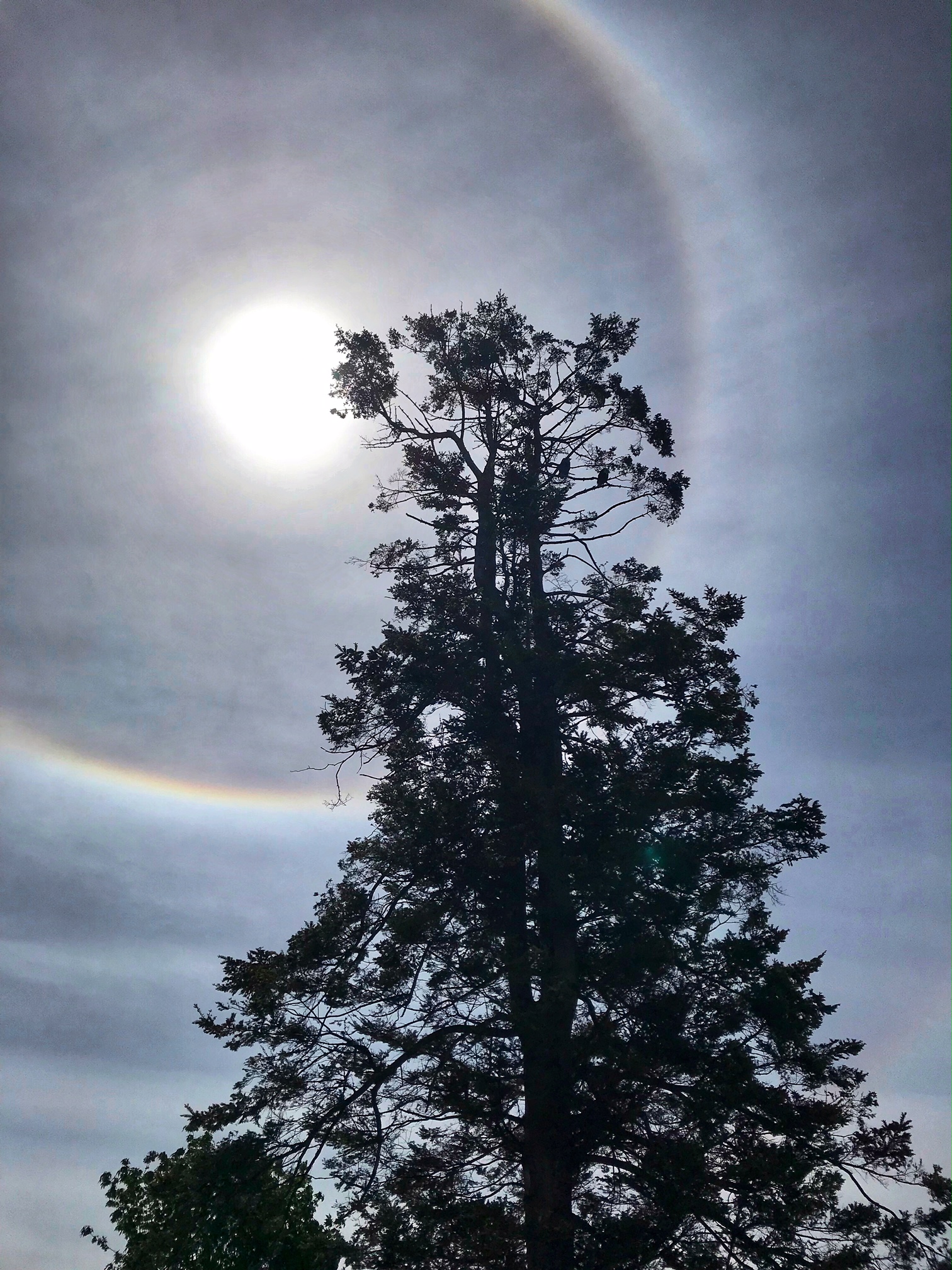 Hearing the squwalking of birds we watched a crow taunting two bald eagles in a tall tree. Better still, was the circumscribed halo around the sun. If you look carefully in area where there's a gap in the branches near the top right of the tree, you can see the eagles.