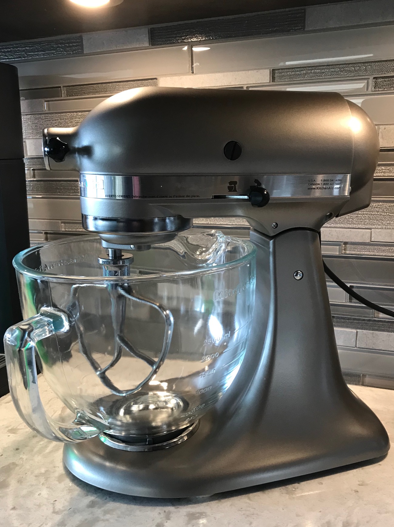In a twist of fate I found myself the owner of a brand new, smaller series KitchenAid mixer in Cocoa Silver, that matches my new kitchen perfectly. It wasn't just fate, it was an example of excellent customer service. We selected a builder's package of appliances and the refrigerator is backordered until August. Without asking, the company offered us a loaner fridge, a partial cash refund for the inconvenience, which paid for the dining set, and the gift of the mixer. Time to expand my baking repertoire.