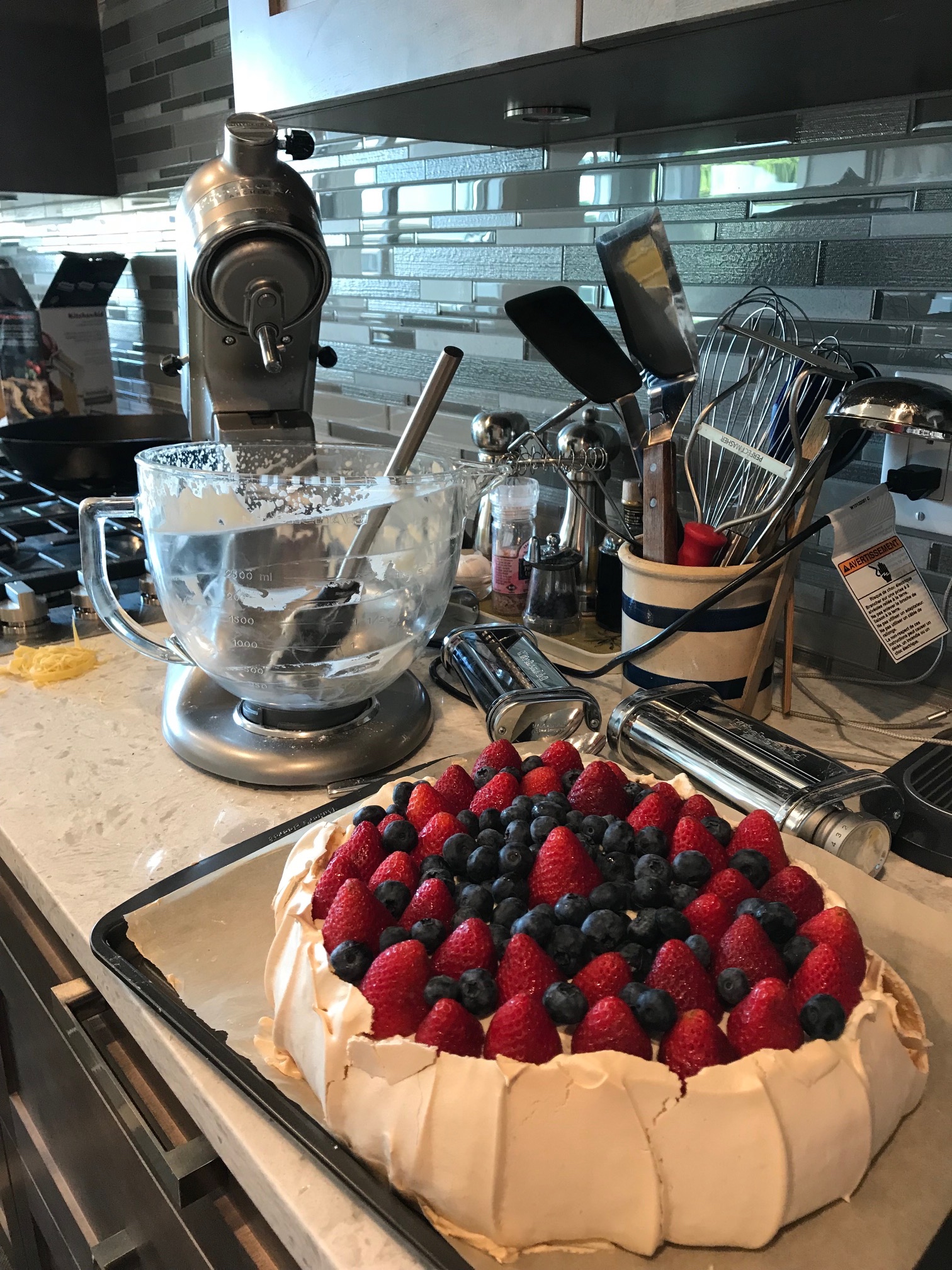 Notice the drying rack, so fancy and stainless to match the appliances? It's my old laundry drying rack, perfect for the job.  Then came the Pavlova.