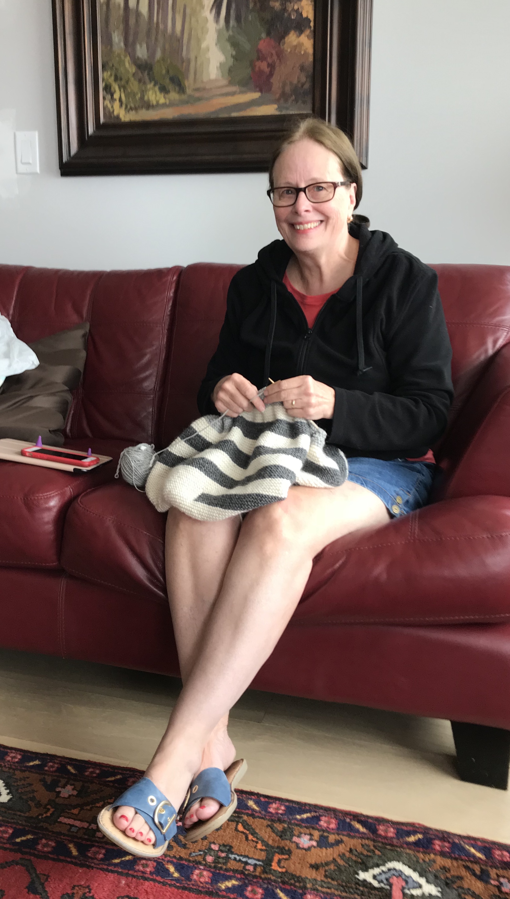 I feel this post is turning Lifesastitch into a food blog, so to anchor it back to its original purpose, here is Marsha knitting her beautiful Metronome shawl.