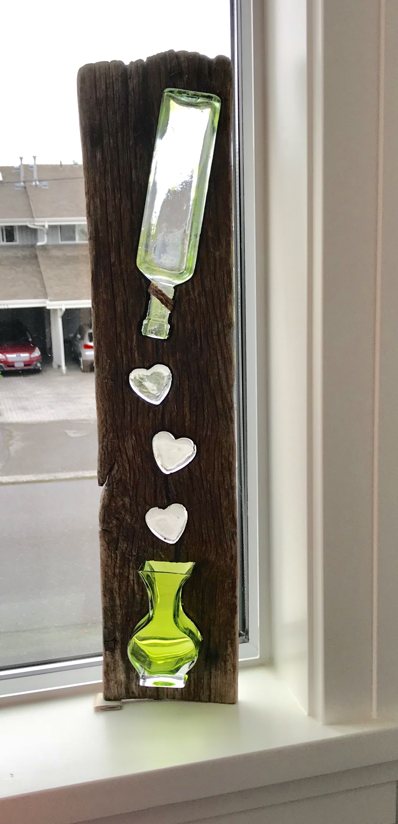 Time to give C some space for his creative retirement activity – garden art. Part of the fun is combing the beach for interesting wood and sifting through thrift at the local stores. This is a 65th birthday gift for his sister. The vase on the bottom can actually hold flowers: