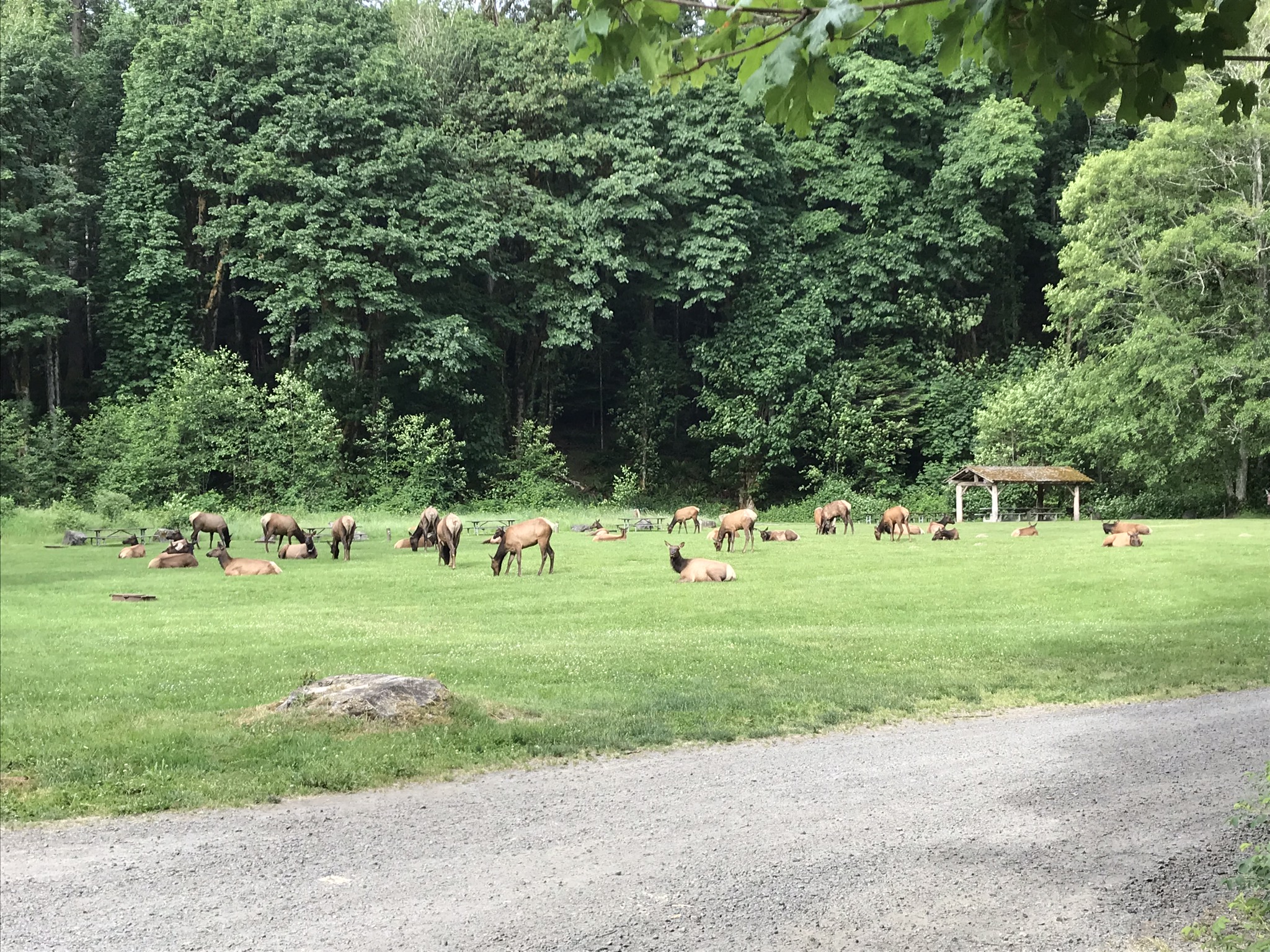 Staying at the site next to Blogless Marsha and Dave, in their camping cabin at Dosewallips State Park in the Olympic Peninsula. It was there we saw a herd of 34+ elk, and a group of 18 bald eagles circling toward the shore.
