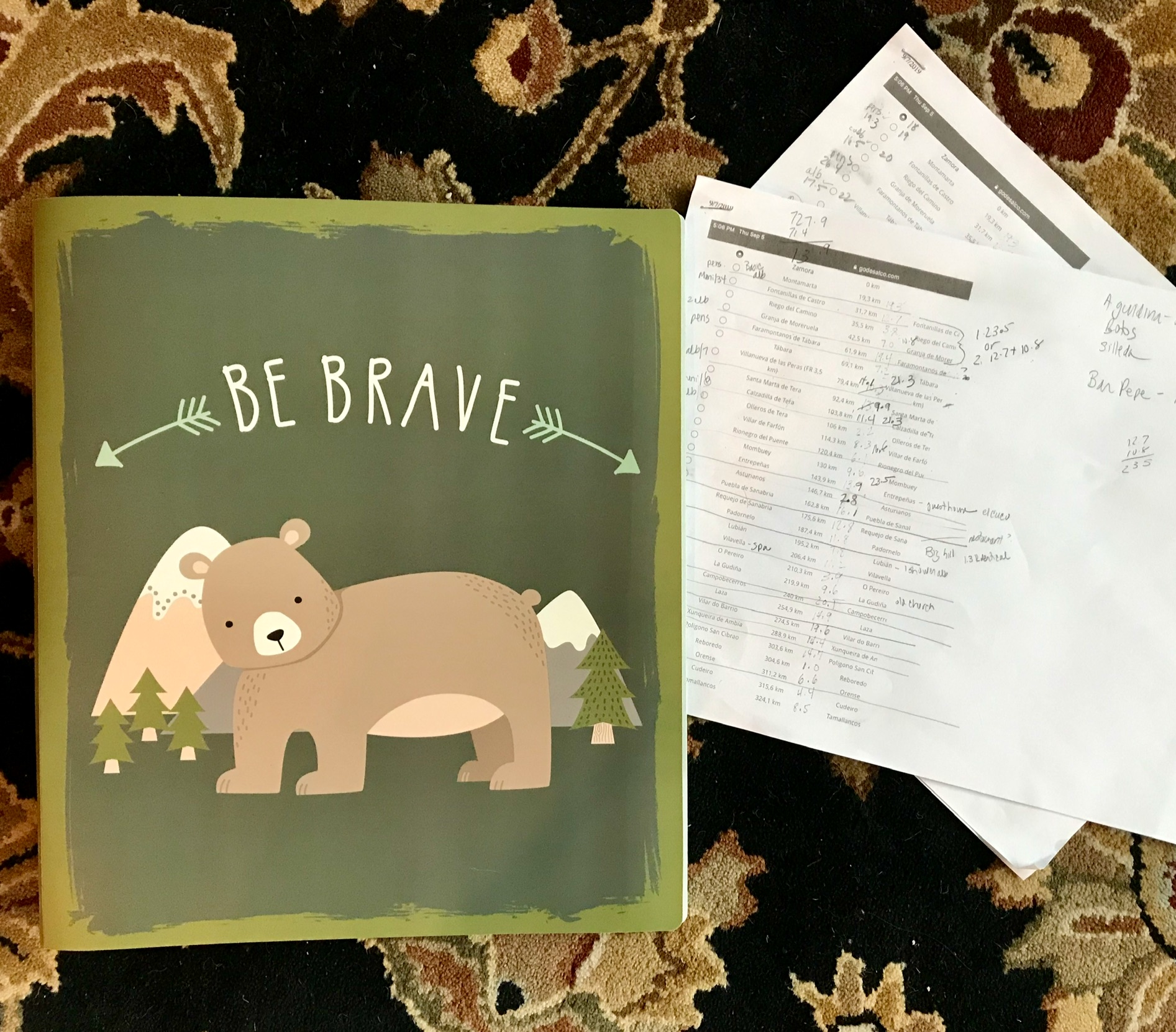 I’ve experienced a wee déjà vu, feeling like I did the third time I was in labour. Whose idea was this anyway? To travel over many flights to walk 250 miles? Ok it’s my idea. Yes, there’s a bit of trepidation and I’m identifying its source. At least we have a fair bit of familiarity having done this twice before. We must have been really really scared the first time. I’m appreciating the binder I bought for our paperwork: