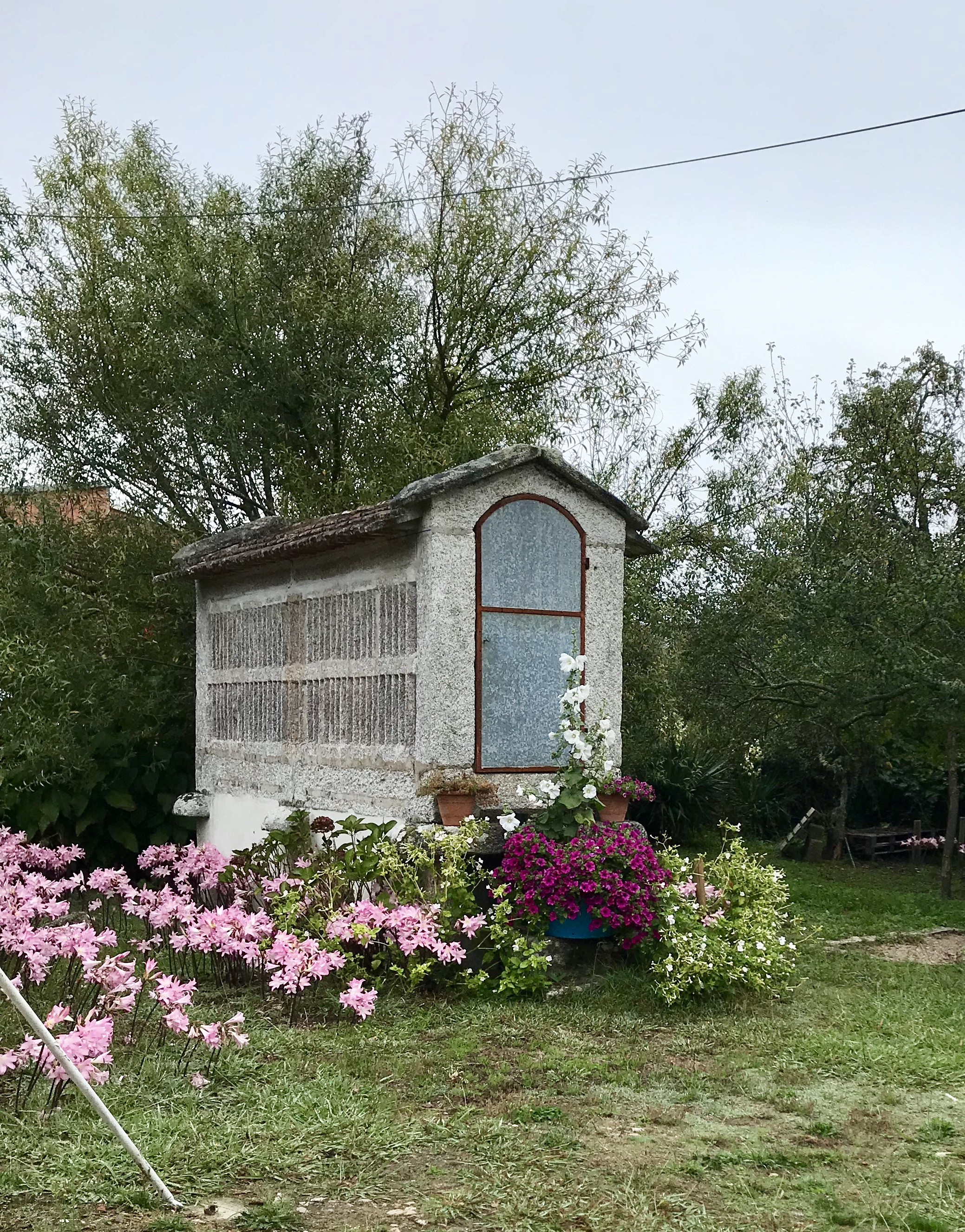When we walk such a rural route I can’t shake this preschool song in my ear: I say good morning to the sun, good morning to the hills, good morning to the chickies and the hens….” The ear worm today should have been The Rain in Spain. I am so thankful for my lightweight hiking umbrella that I can attach to my pack so I can still walk with poles.