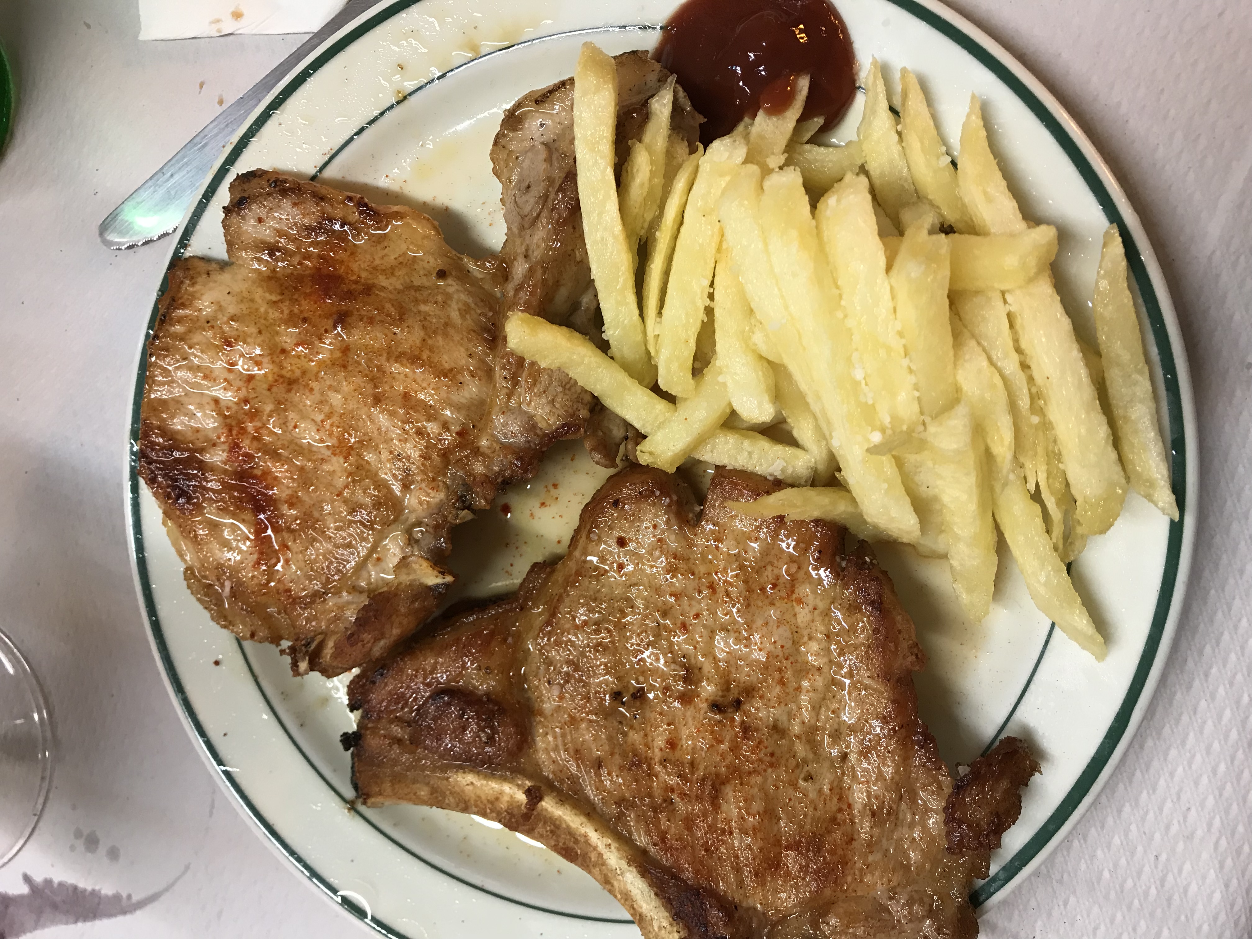 Dinner was a mere 18 steps each way from our room as opposed to last night’s 3k. It was adequate pilgrim fare. 18e for two bought an amazing amount of food: chicken broth with noodles, bread, fries and two pork chops each, dessert, 1.5 bottles of light chilled wine and two bottles of agua con gaz (fizzy water).