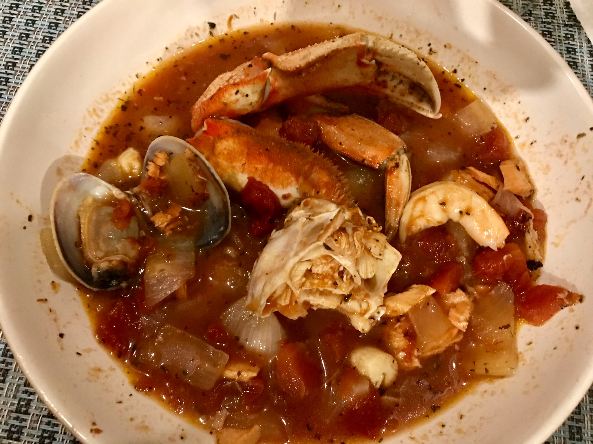 We started with a treat: Bouillabaisse. I asked B if he wanted to head to the dock for some crabbing. Given the heavy weather we decided it was worth spending $16 on a large crab rather than buy bait to hang out in the cold wet with no guarantees. It lasted for two dinners and a lunch.