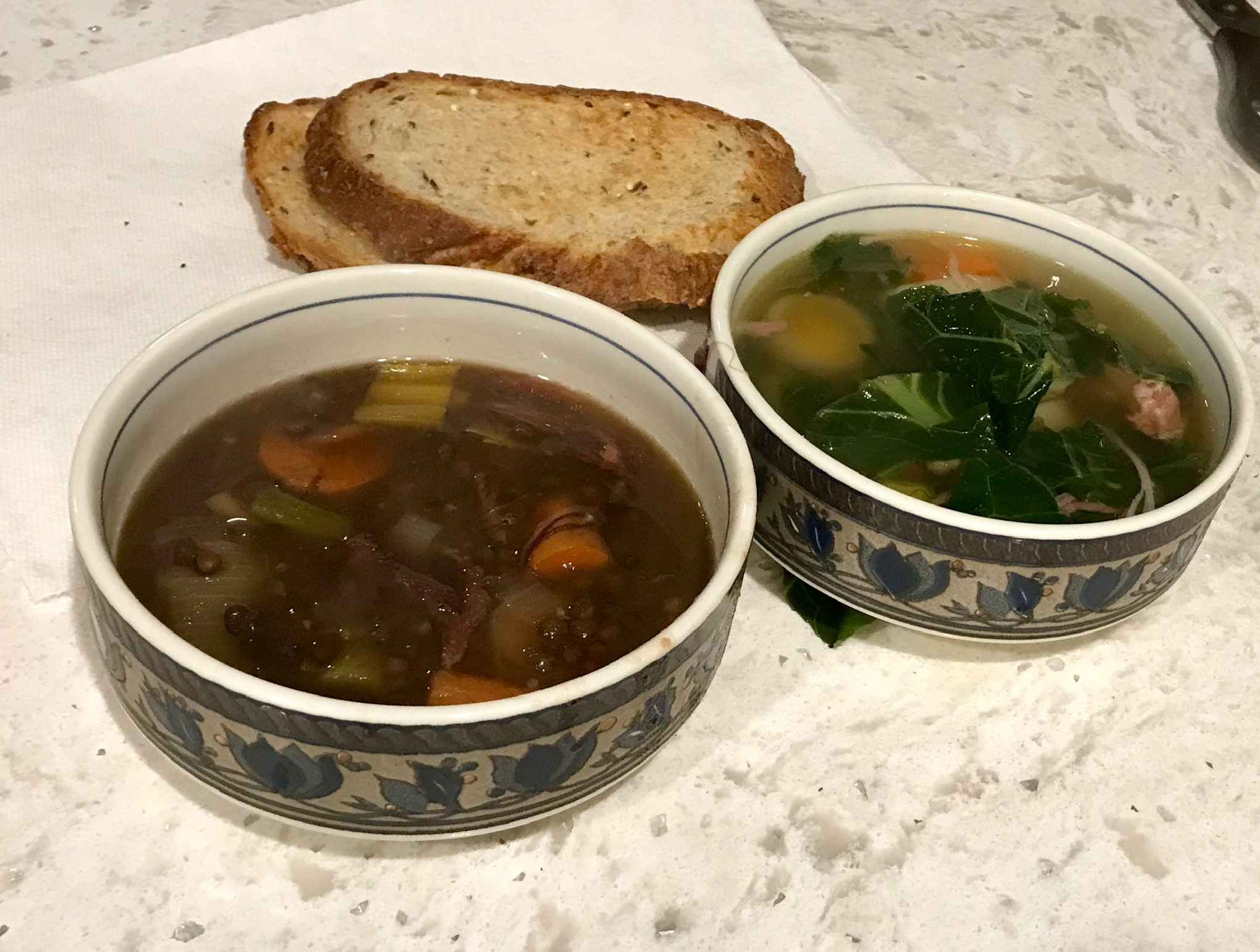 The instant pot was put to work for ham broth and lentil soup. Half the broth went into our favorite from Spain: Caldo Gallego, which is ham, leeks, white beans, potatoes and a mixture of greens – collards, mustard and turnip greens.