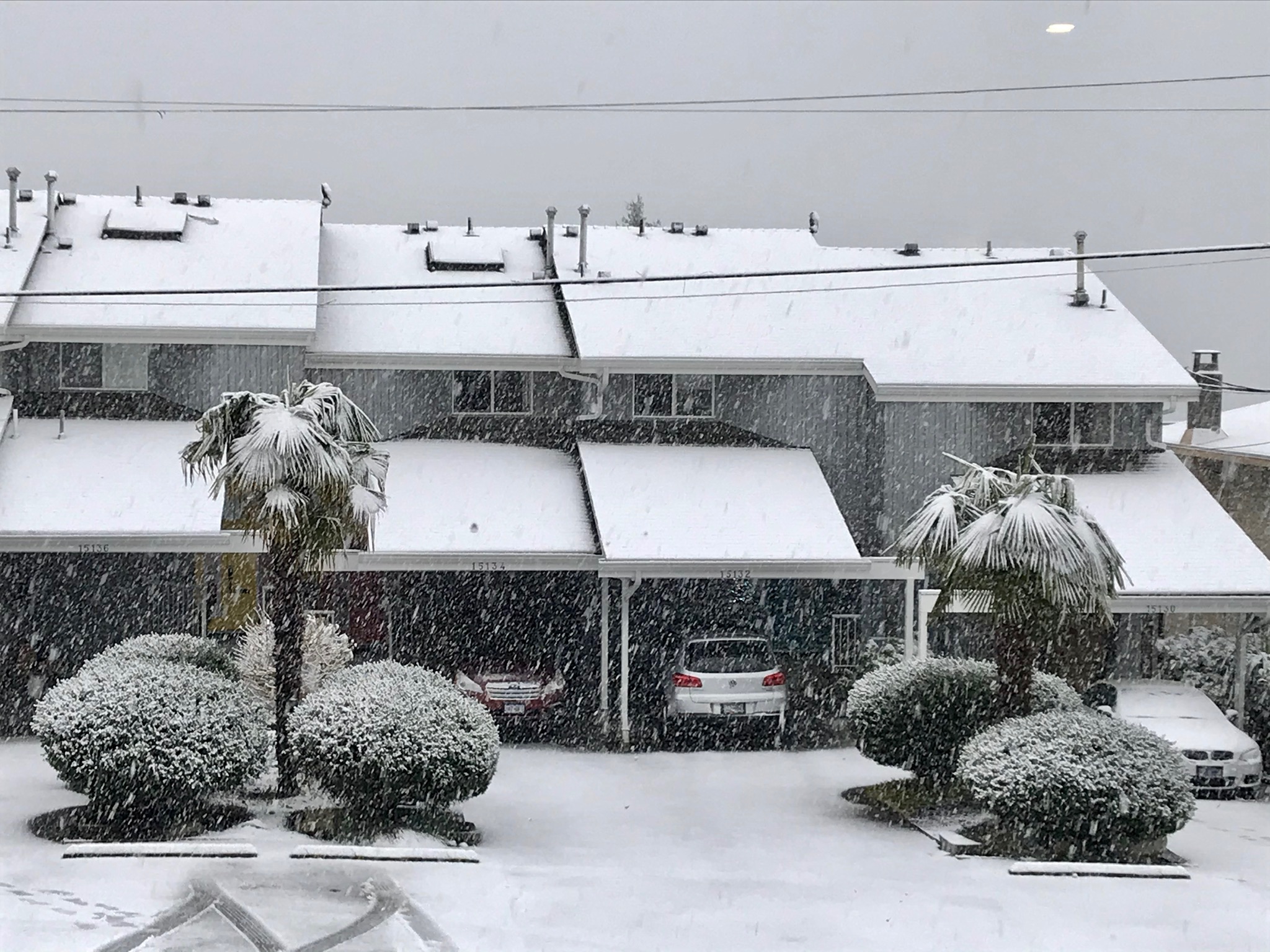In this unusual time we were even gifted with a rare snowfall. Although the palm trees at a condos across the street looked as if they were shivering in the cold: