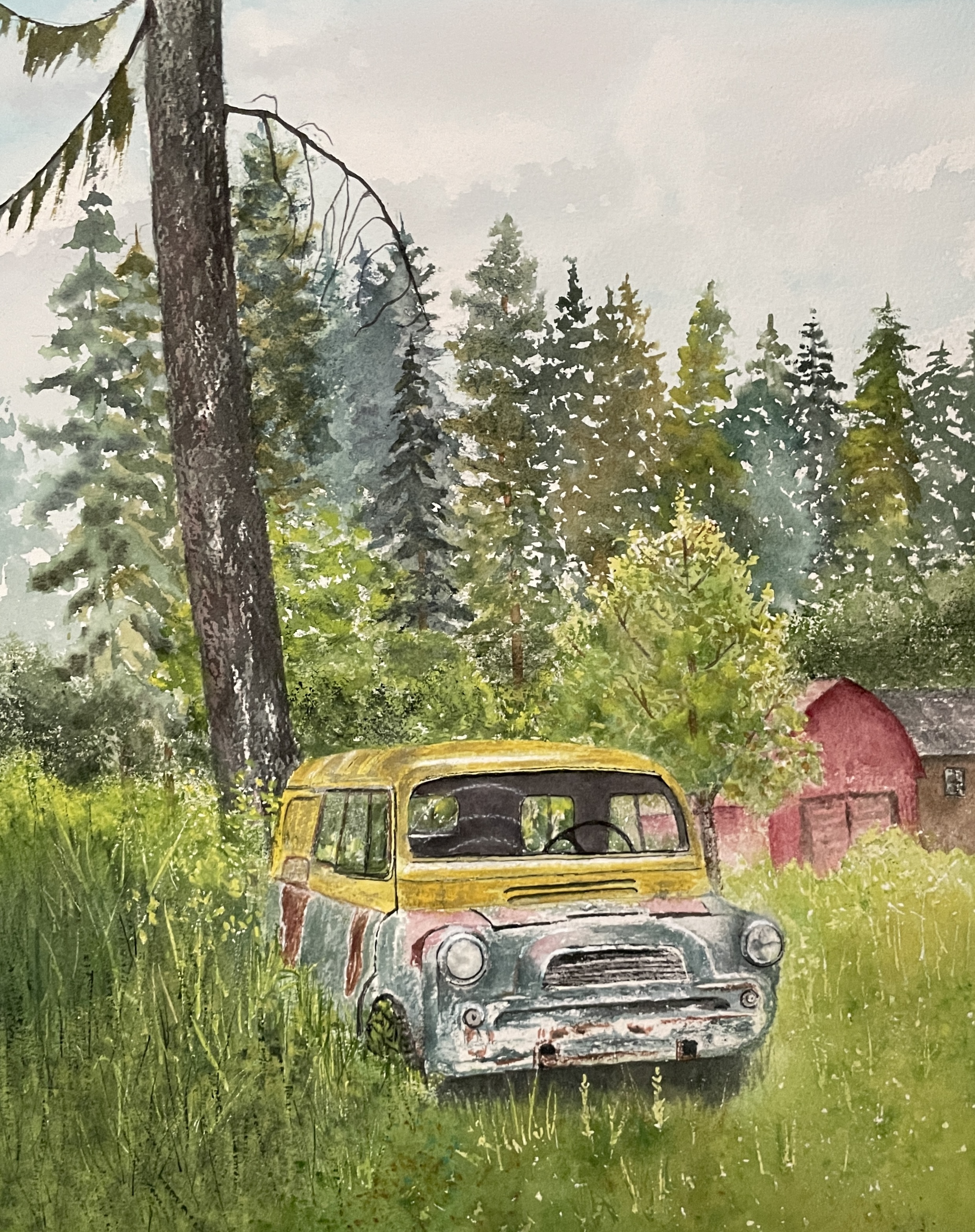 It extended the camping/picnic table painting season. We had the camper on the road for a record number of nights. This is my painting of a pug-nosed van, a 1960's Bedford CA, parked near one of our favourite camping spots at Pinantan Lake, BC.
