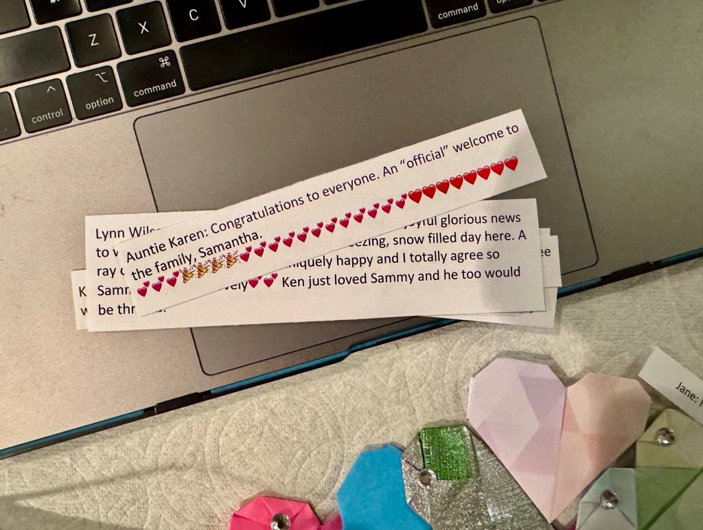 Thanks to all of you who responded to the news. I wanted a creative way to share your good wishes. Consulting with Elina, who is good at such things, we came up with origami hearts containing a strip of paper with each of your messages.