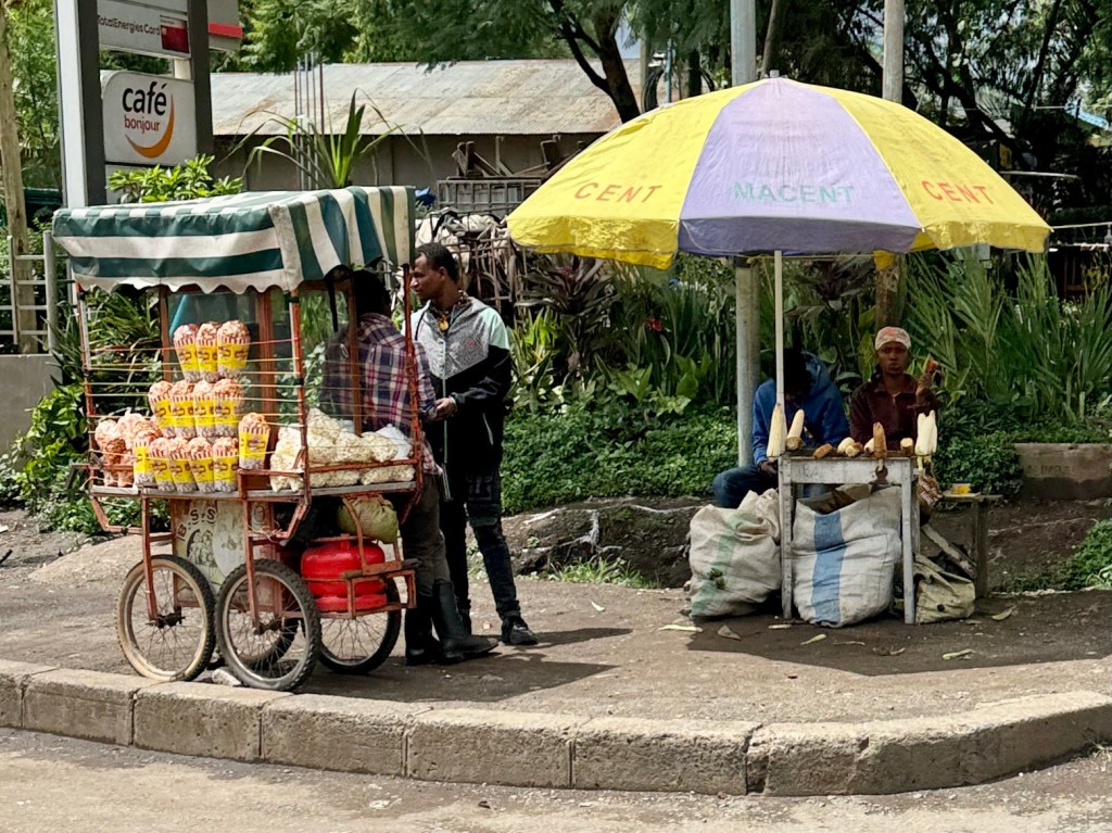 Roadside stands sold fruit and the popular snack: popcorn.