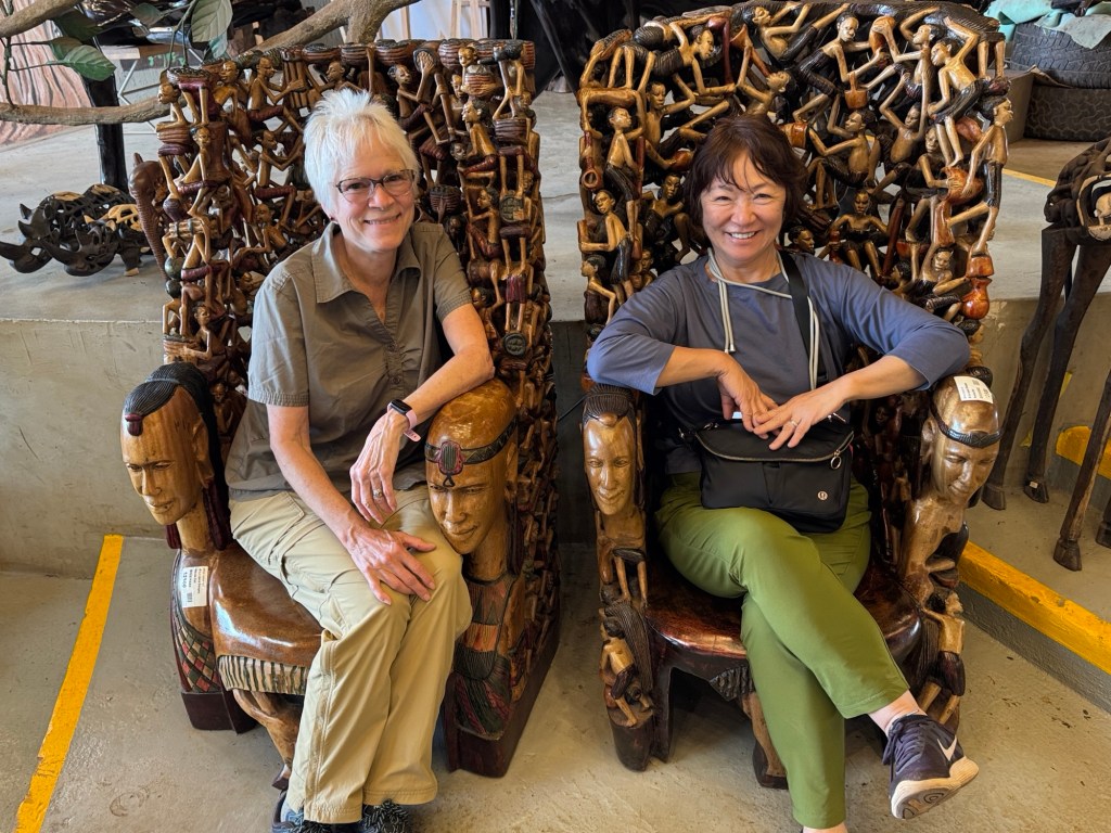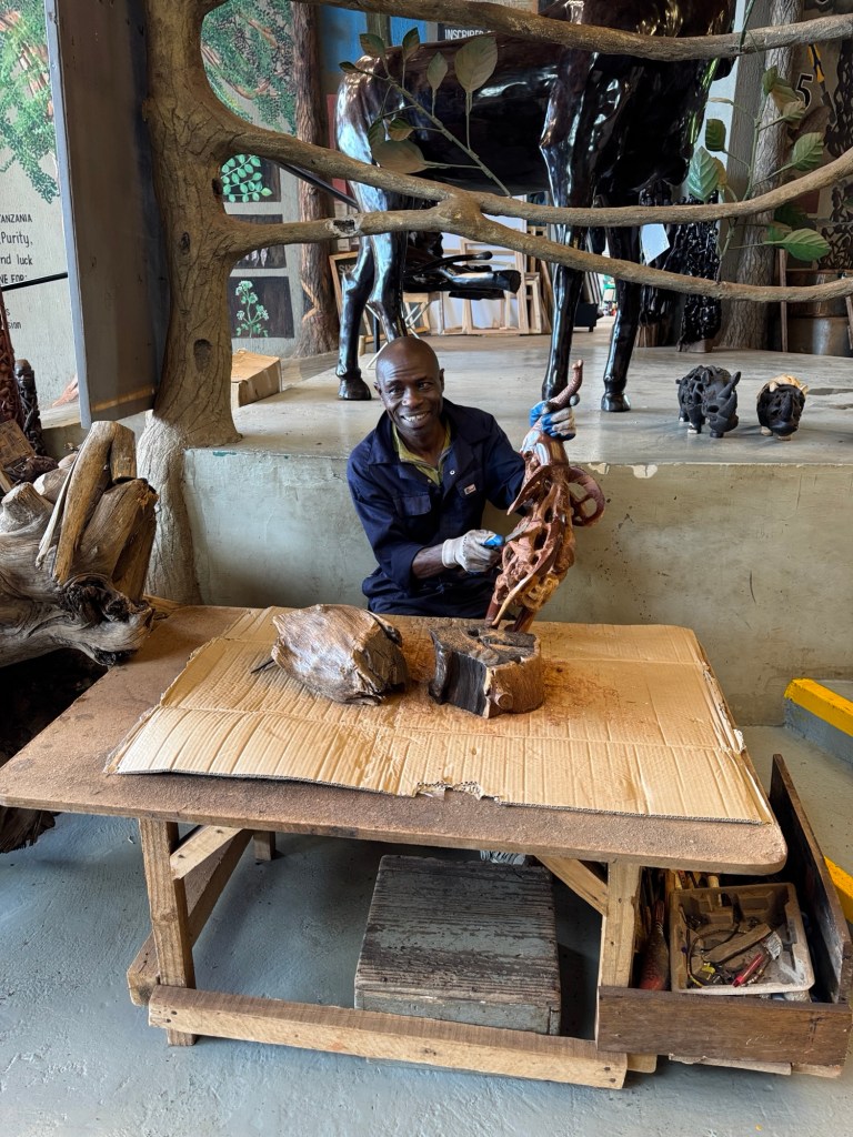and a huge store featuring textiles, t-shirts, Maasai beaded crafts and all the usual suspects from the typical souvenir warehouses. As the items were priced, seemingly more reasonably than our previous experience, we requested a return visit on our way home. The only things I’ve bought on the trip is a tiny soapstone elephant for our crèche and a T shirt, both from the elephant orphanage in Nairobi. They were priced higher than usual, but I have a soft spot for non profit fund raising.