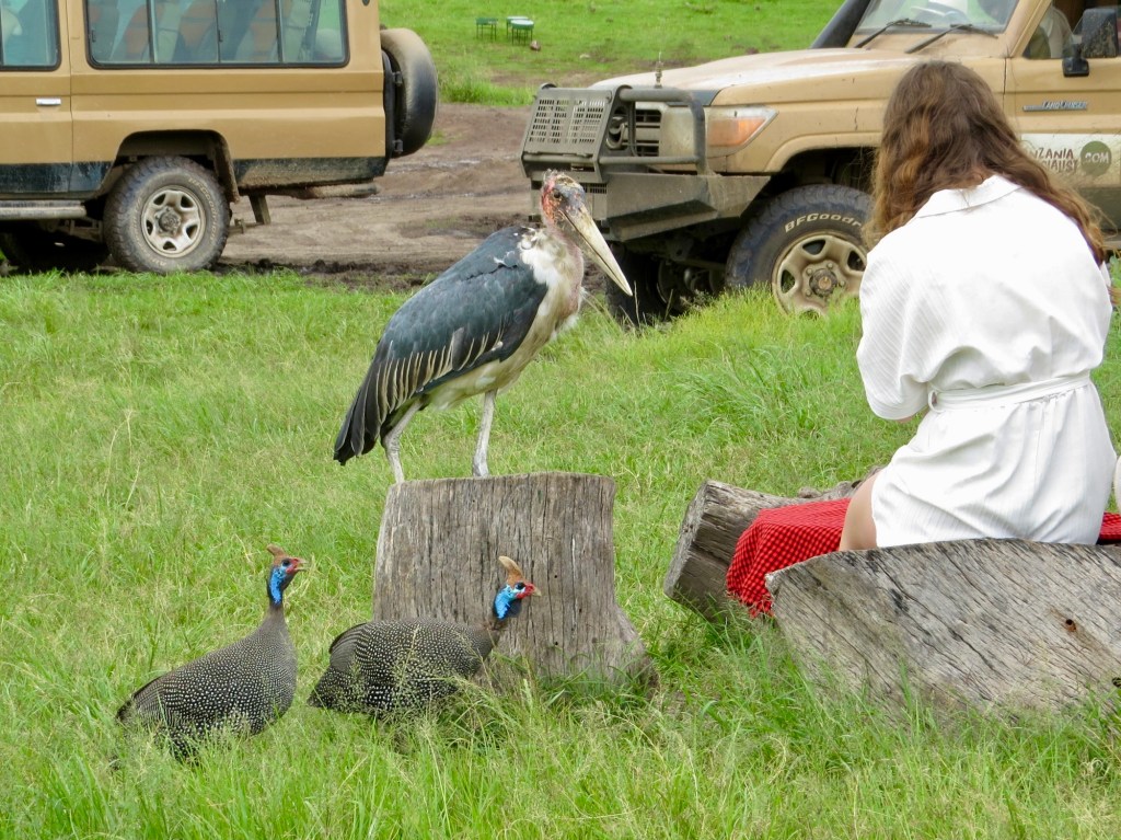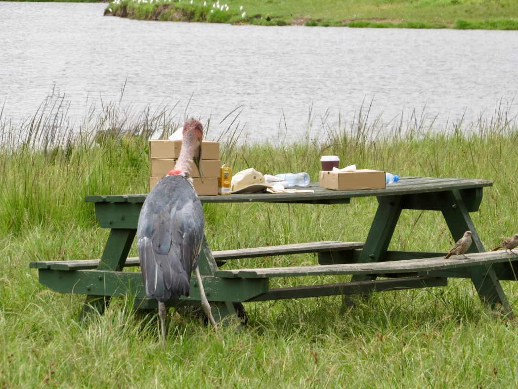 At our picnic spot on the lake there were thieving birds, Pelicans and Guinea Fowl.
