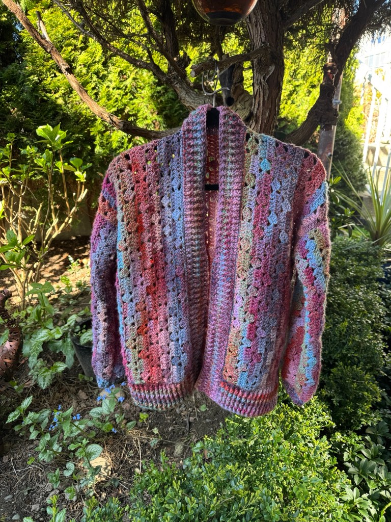 I deviated from the pattern by assembling it first, then adding a double crochet front and back rib all around, with five button holes and ribbing on the cuffs. Now waiting for custom wood buttons from Chuck’s workshop.