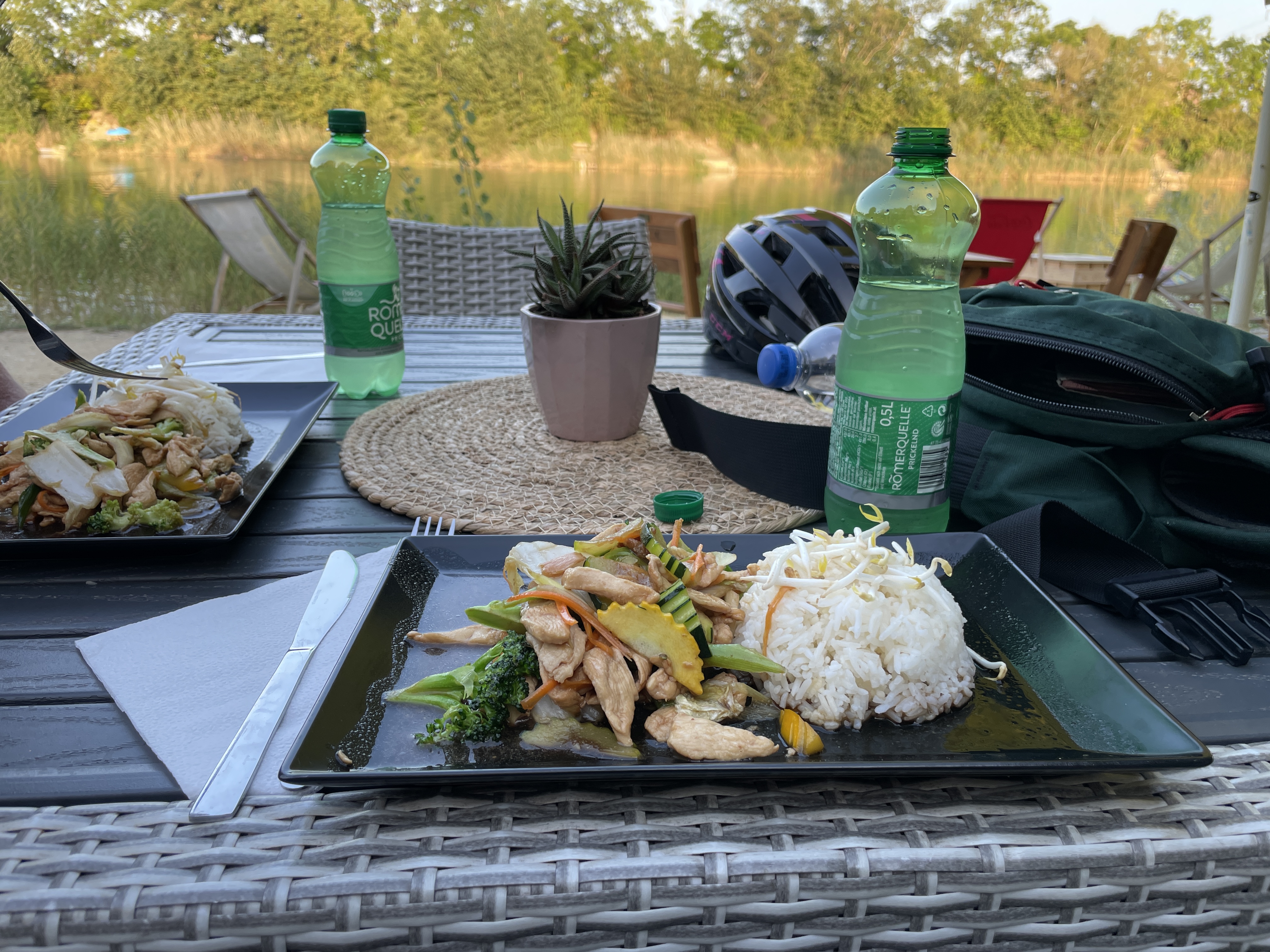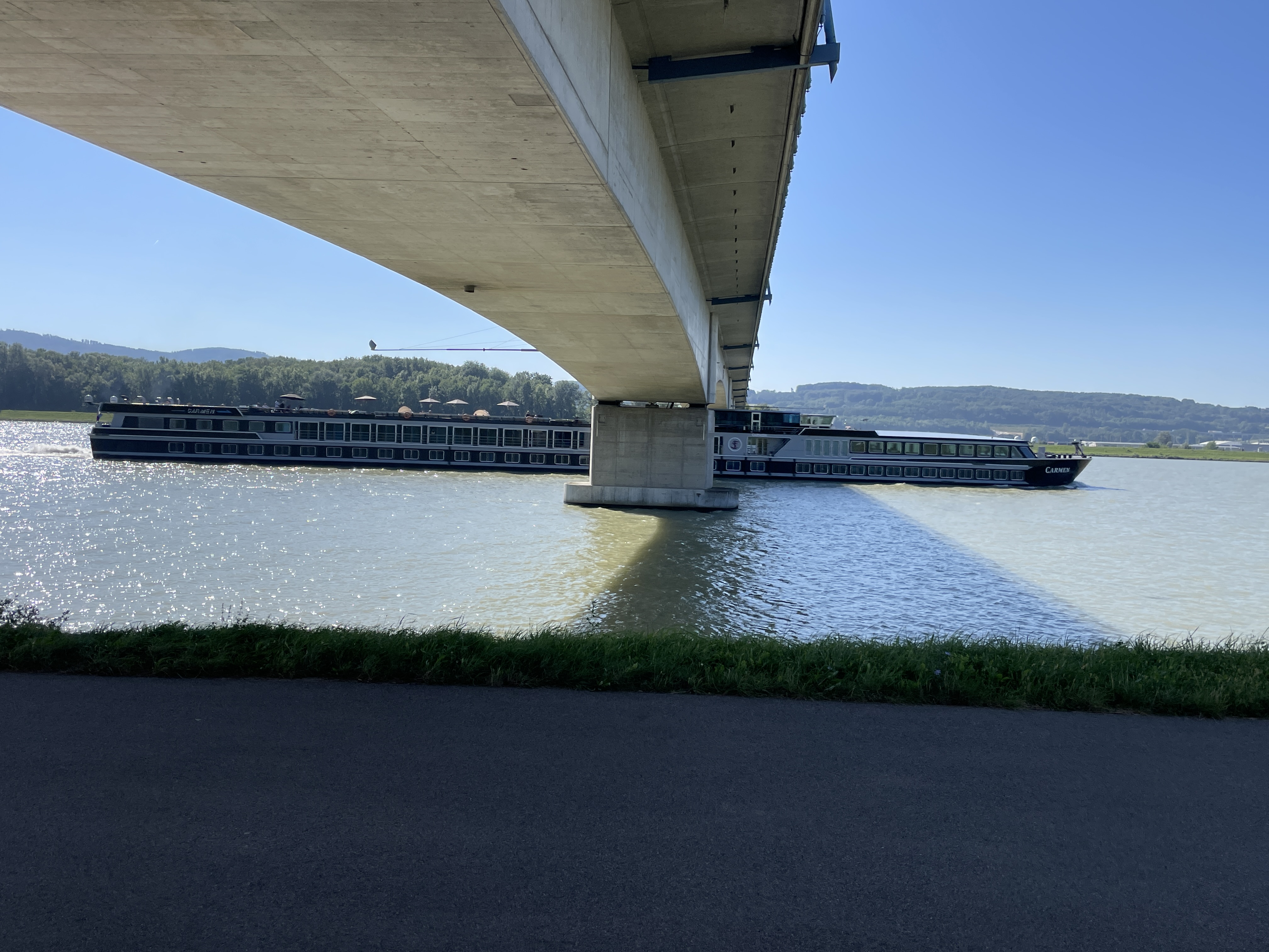 Thinking there might be a more direct route from the village to the cycle path we started off. We stopped at one dead end and decided to press on. C took off not noticing I had bike troubles and by the time I had things straightened out he was long gone. I knew we needed to cross a major bridge, the problem was finding the access point. I followed a confident looking cyclist who knew a short cut along a first path. Back on the main route I crossed the bridge, and stopped in the shade underneath to check my email. Sure enough there was one from C and we arranged a meeting point. Two important lessons here: buy two SIM cards for emergency purposes and a rear view mirror.