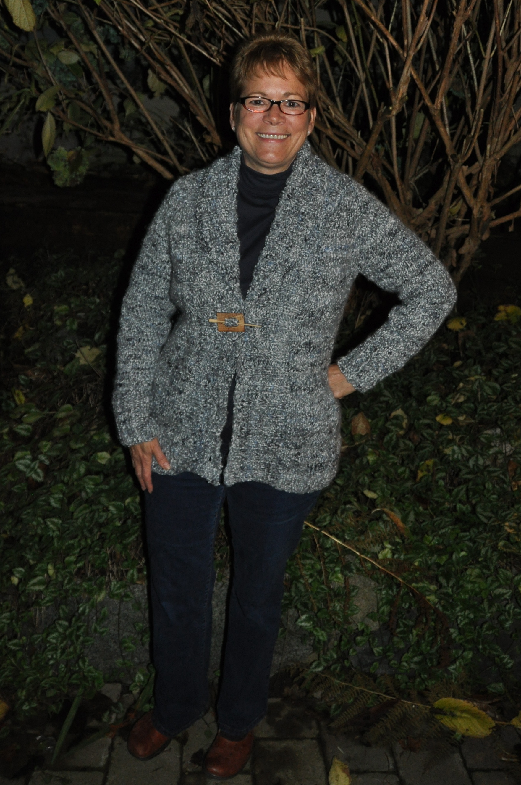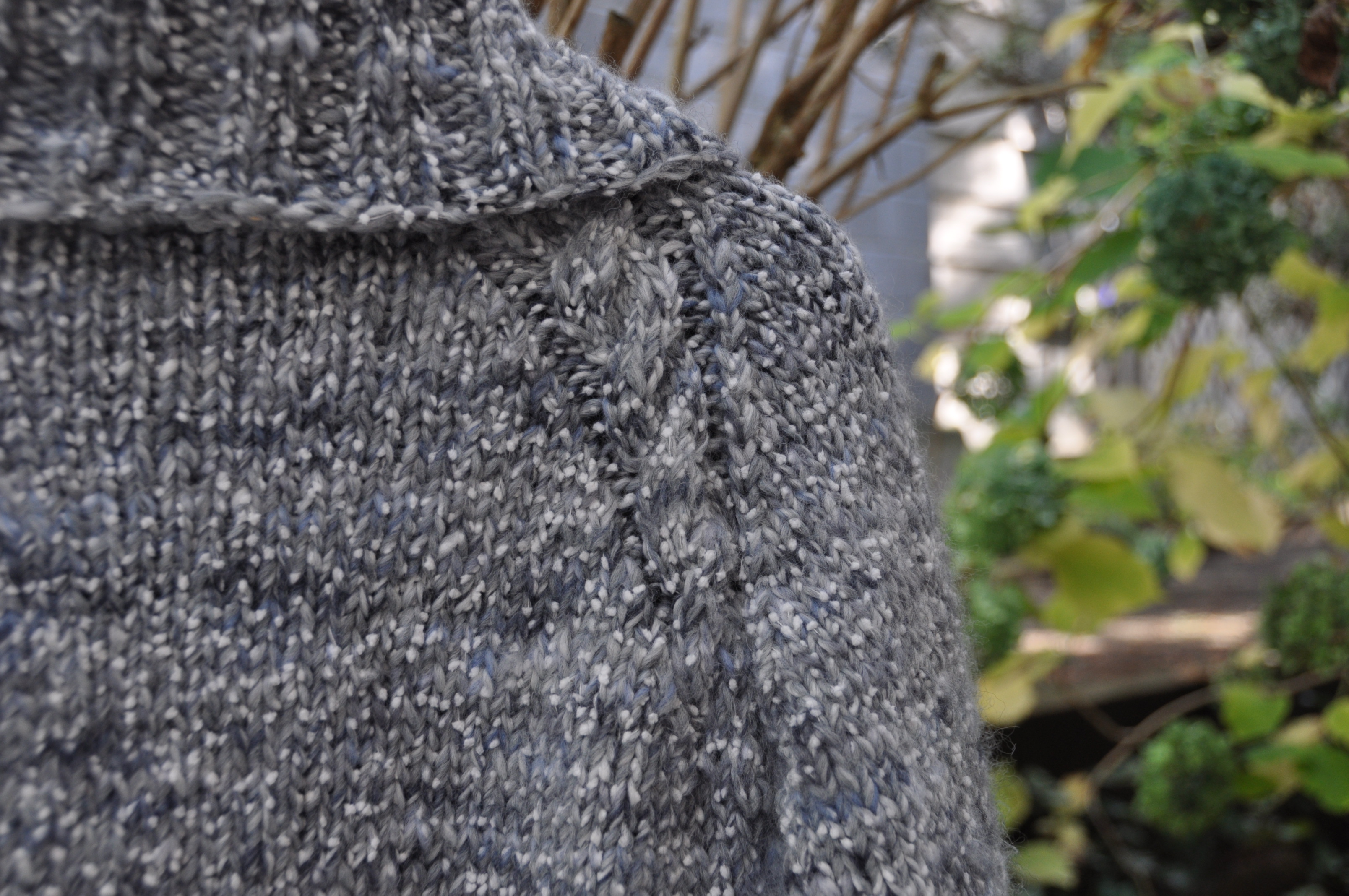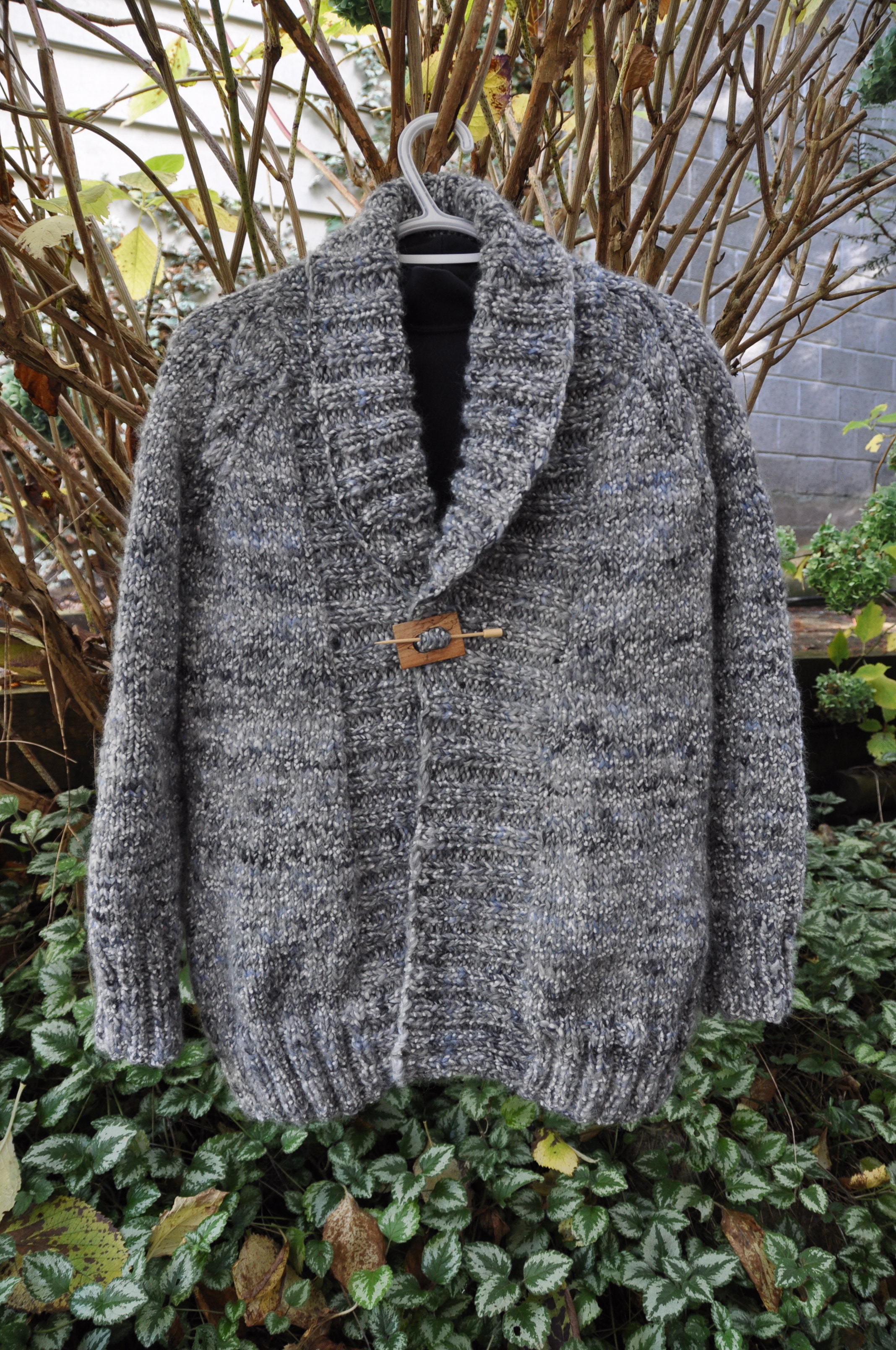 The Y/O's really looked silly with bulky yarn. Other mods included making it a little longer, the button bands a little wider and adding two more buttons (using the one-row buttonhole technique) as I didn't like the peek-a-boo belly look in some of the Ravelry photos. In my photo, I used one of C's shawl pins as he hasn't yet gotten around to making the buttons.